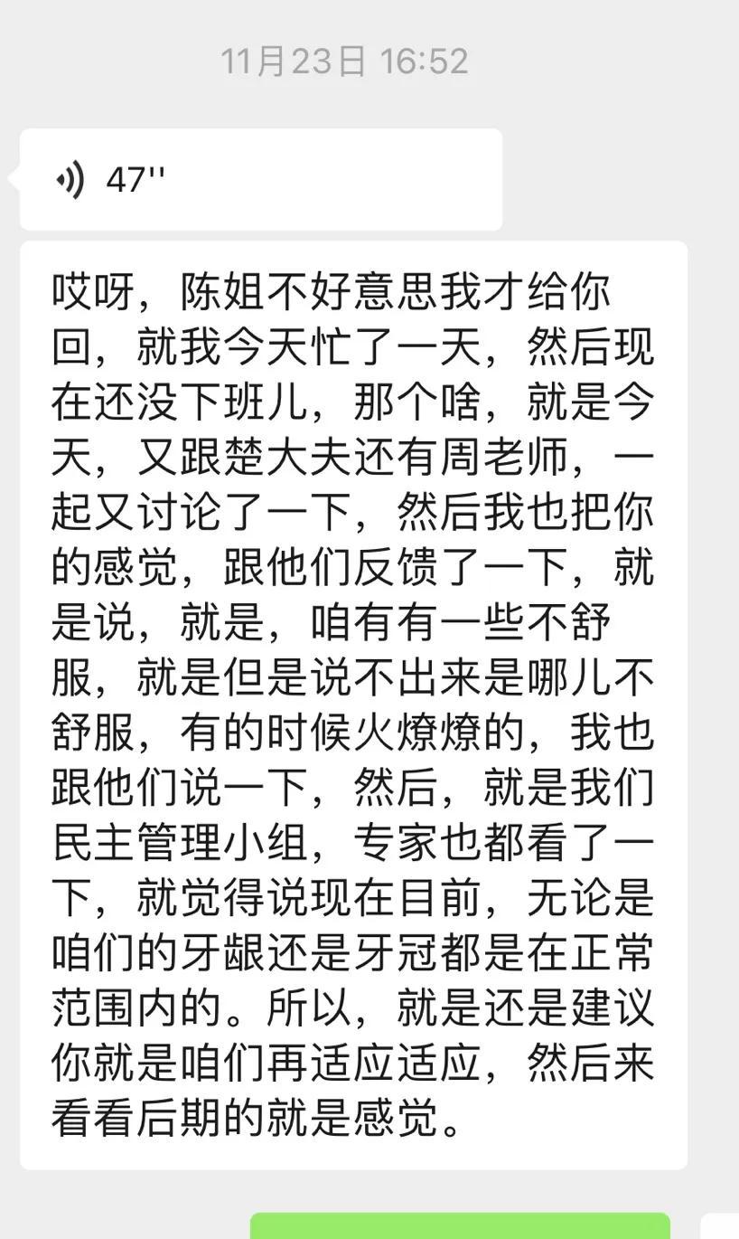 2022年7月份戴牙冠 當(dāng)時(shí)這個(gè)牙冠戴了兩個(gè)小時(shí) 特別疼 像一顆螺絲釘 擰進(jìn)肉里 再擰出來(lái) 再擰進(jìn)去…反反復(fù)復(fù) 兩個(gè)多?小時(shí) 疼得?快暈過(guò)去了 在調(diào)節(jié)椅上下來(lái)全身都是抖的 拿手機(jī)都費(fèi)勁 中途有護(hù)士詢(xún)問(wèn)醫(yī)生? 能不能打點(diǎn)麻藥 看著太疼了 被醫(yī)生拒絕