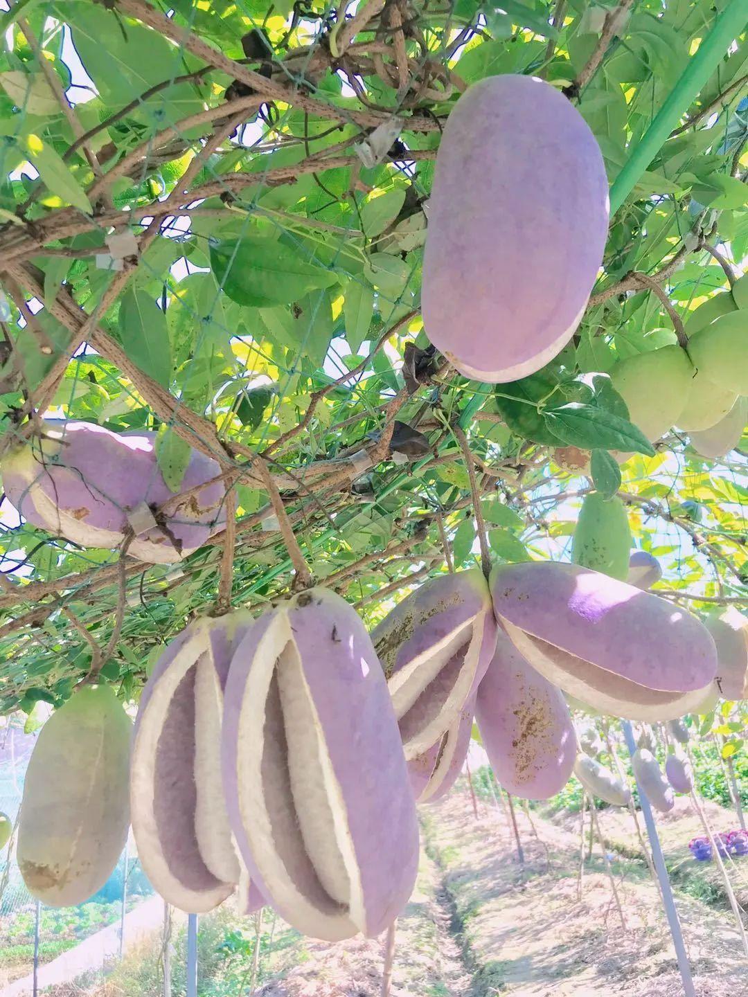 不過也有欣喜的,比如在江西吃到的八月瓜,甜糯的口感,也讓他心心念念地想把它帶回舟山。這種乍看就像大號紫色豆莢的水果,江西、云南、貴州等地都有,在舟山就是稀罕物了。抱著試一試的心情,運(yùn)苗回舟山種,沒想到這家伙長勢喜人,甚至比在原產(chǎn)地還要長得好,苗子長得粗壯,結(jié)出的果實(shí)光鮮亮麗,滋味口感更勝一籌。