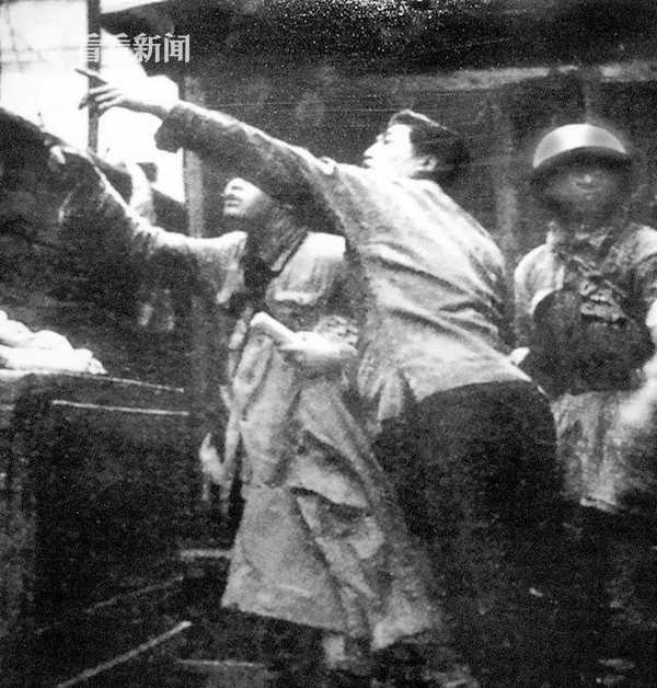 三人兩支突擊步槍、一支駁殼槍,一下沖進了四行倉庫四樓的敵青年軍204師指揮部?!耙簧先ヒ院?,(我)大吼一聲:‘都不要動,繳槍不殺,我們是中國人民解放軍,你們老老實實投降,誰要動,就槍斃了誰!’嚇的??!地下一點聲音都沒有,都趴在地下。就在這個時候,一個戴著帽子,拿著左輪手槍的(出來了),‘吵什么!’我們沒吭聲,那些當兵的也不吭聲。‘誰來了?’”就在這個緊要關頭,沖上去,一把逮住了他。“我拿著個駁殼槍對著他腦袋上,那個通訊員(張瑞林)很激動,沖鋒槍對在他肚子上。”