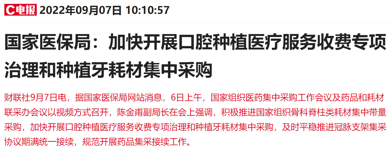 口腔種植領(lǐng)域的“天價(jià)收費(fèi)”現(xiàn)象一直被詬病。種一顆牙動(dòng)輒上萬(wàn)元,甚至有“一口種植牙、縣城一套房”的說法。今年以來,一直在推進(jìn)種植牙集采相關(guān)工作。1月10日,國(guó)務(wù)院常務(wù)會(huì)議曾明確提出,今年要對(duì)群眾關(guān)注的骨科耗材、藥物球囊、種植牙開展集采。8月18日,醫(yī)保局出臺(tái)《關(guān)于開展口腔種植醫(yī)療服務(wù)收費(fèi)和耗材價(jià)格專項(xiàng)治理的通知(征求意見稿)》(以下簡(jiǎn)稱《意見稿》),規(guī)范口腔種植醫(yī)療服務(wù)和耗材收費(fèi)方式,強(qiáng)化價(jià)格調(diào)控,廣泛發(fā)動(dòng)種植牙耗材省際集采,加強(qiáng)價(jià)格監(jiān)管。