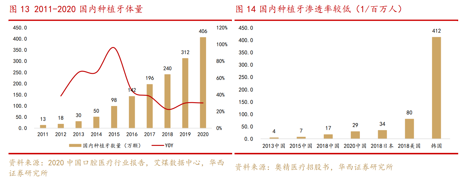 老齡化下高需求驅(qū)動(dòng)種植牙數(shù)量高速增長(zhǎng)。華西證券分析師崔文亮5月11日發(fā)布的研報(bào)指出,2020年我國(guó)種植牙數(shù)量為406萬(wàn)顆,2015年以來復(fù)合增速高達(dá)32.88%,相當(dāng)于29顆/萬(wàn)人,雖顯著優(yōu)于2015年的7顆/萬(wàn)人,但與鄰近的韓國(guó)220萬(wàn)顆(412顆/萬(wàn)人)、日本43萬(wàn)顆(34顆/萬(wàn)人)相比,我國(guó)的種植牙滲透率仍較低,潛在存量需求數(shù)量約4000萬(wàn)顆,尚有十倍發(fā)展空間,預(yù)期隨著老齡化加速及大眾對(duì)口腔問題愈加重視以及執(zhí)業(yè)醫(yī)師供給的增加,國(guó)內(nèi)種植牙需求仍將維持高速增長(zhǎng)水平。