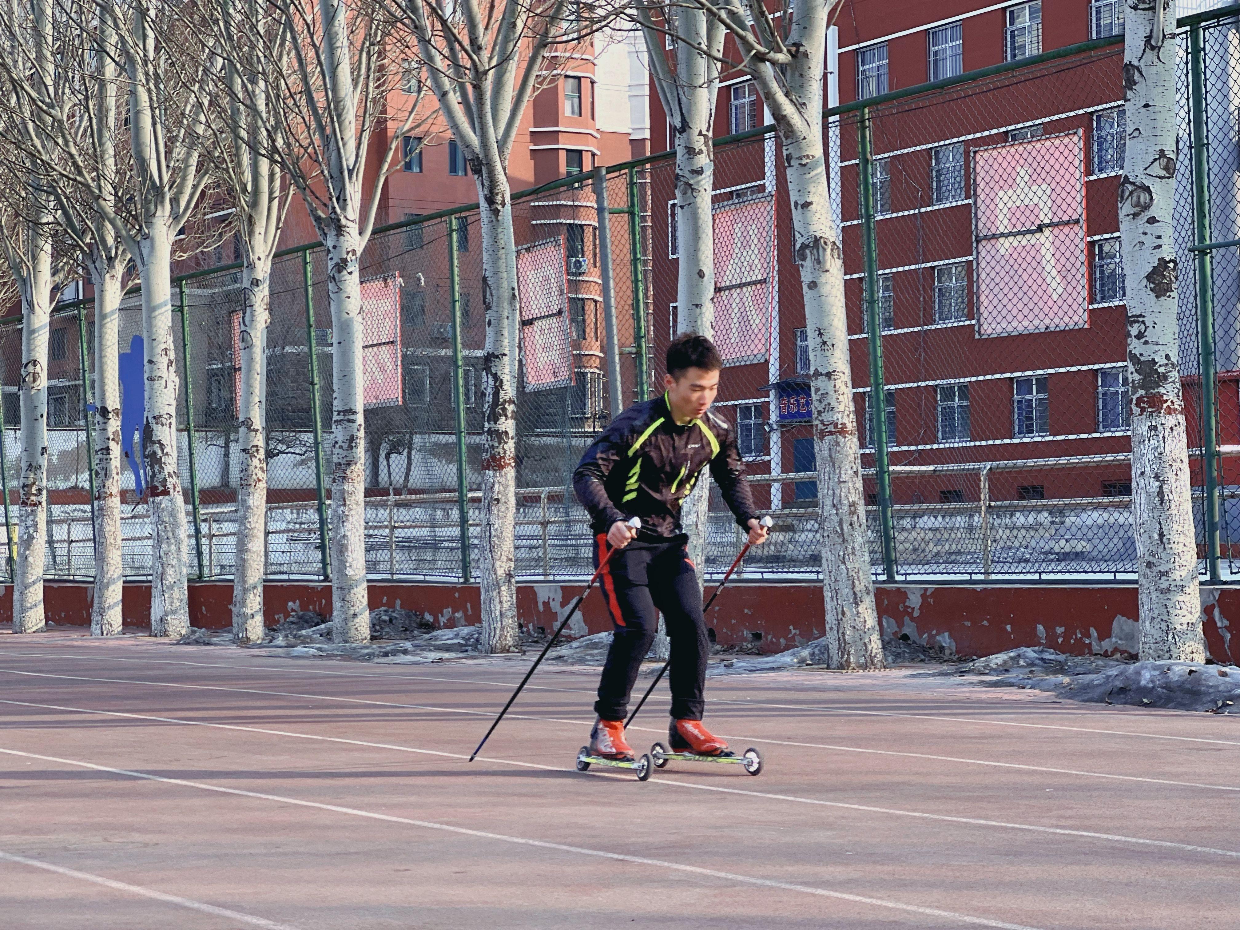 2月10日下午,冰雪班旱面訓(xùn)練場中,16歲的越野滑雪運(yùn)動(dòng)員崔健正獨(dú)自練習(xí)。新京報(bào)記者 咸運(yùn)禎 攝