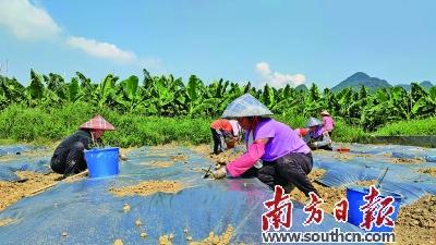 據(jù)了解,今年4月,白花塱村憑借優(yōu)越的土地資源和氣候條件,成功引進清遠鳳嶺藥谷中藥科技有限公司,發(fā)展中藥材種植。通過前期除草、翻土、下底肥、蓋膜等步驟,現(xiàn)在正式下苗種植。