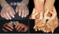 皮膚出現(xiàn)硬化,皮堅(jiān)實(shí)厚亮。在疾病更晚期,這些部位變得緊繃,肘、膝關(guān)節(jié)攣縮,出現(xiàn)面具臉。