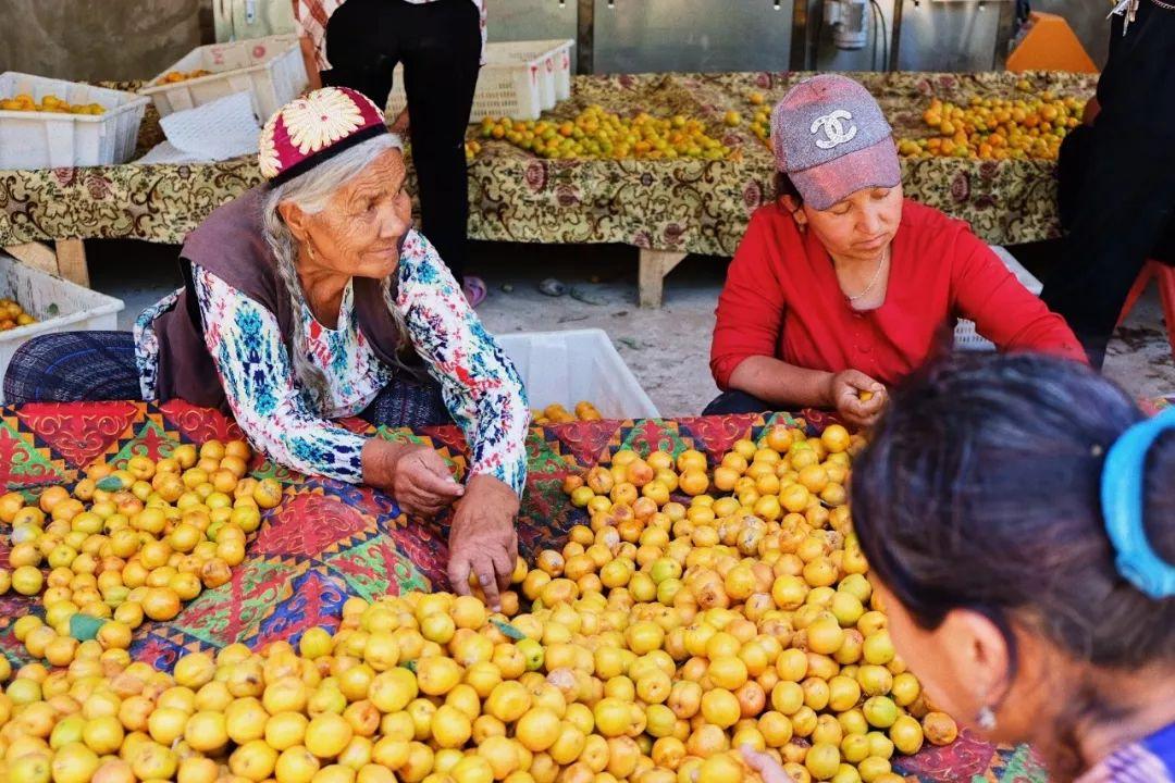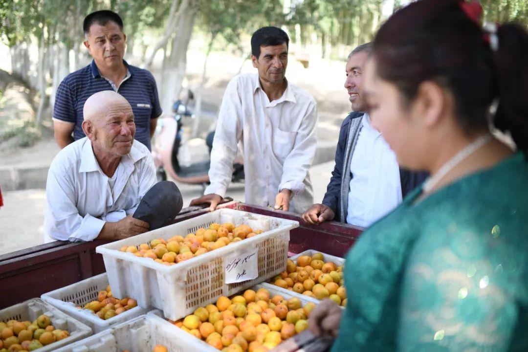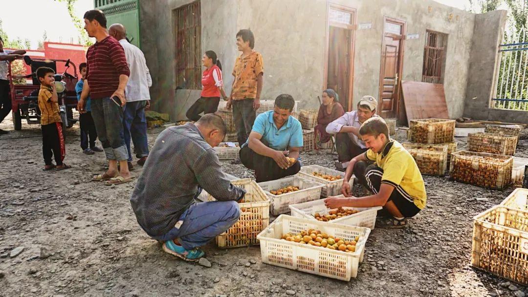59歲的賽帕爾·圖爾蓀(左1)與村民討論杏子的好收成