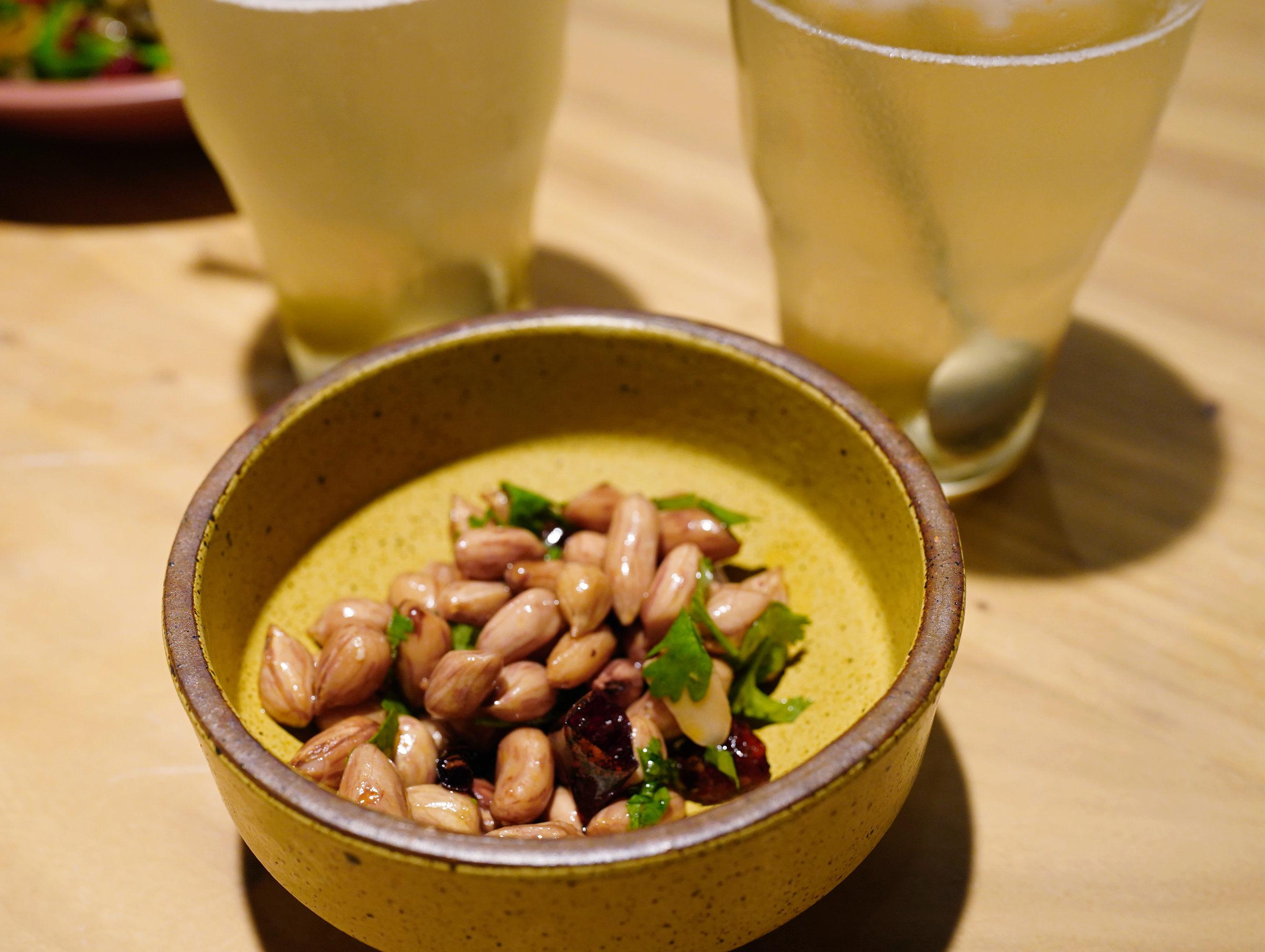 今天先來晚餐,送了碟五彩花生開胃,酥酥軟軟的五香,配餐廳自己腌的青梅蘇打消暑。