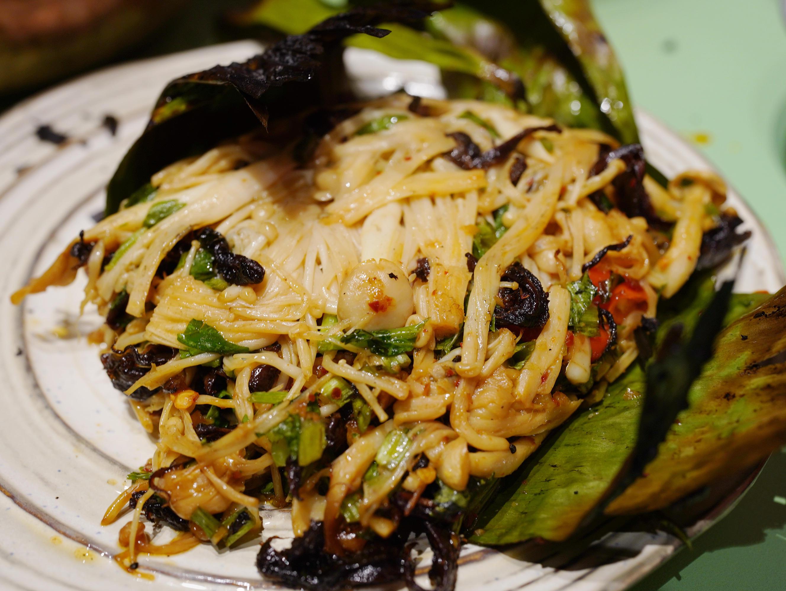 芭蕉葉烤菌菇,撕開表層焦黑的葉子,露出里面濕潤的菌子,畢竟是人均不高的餐廳,沒有用貴價(jià)的野生菌,只是尋常的金針菇、黃花菜,但稍許加一點(diǎn)自家的油雞樅,沁出鮮美,就很提味。