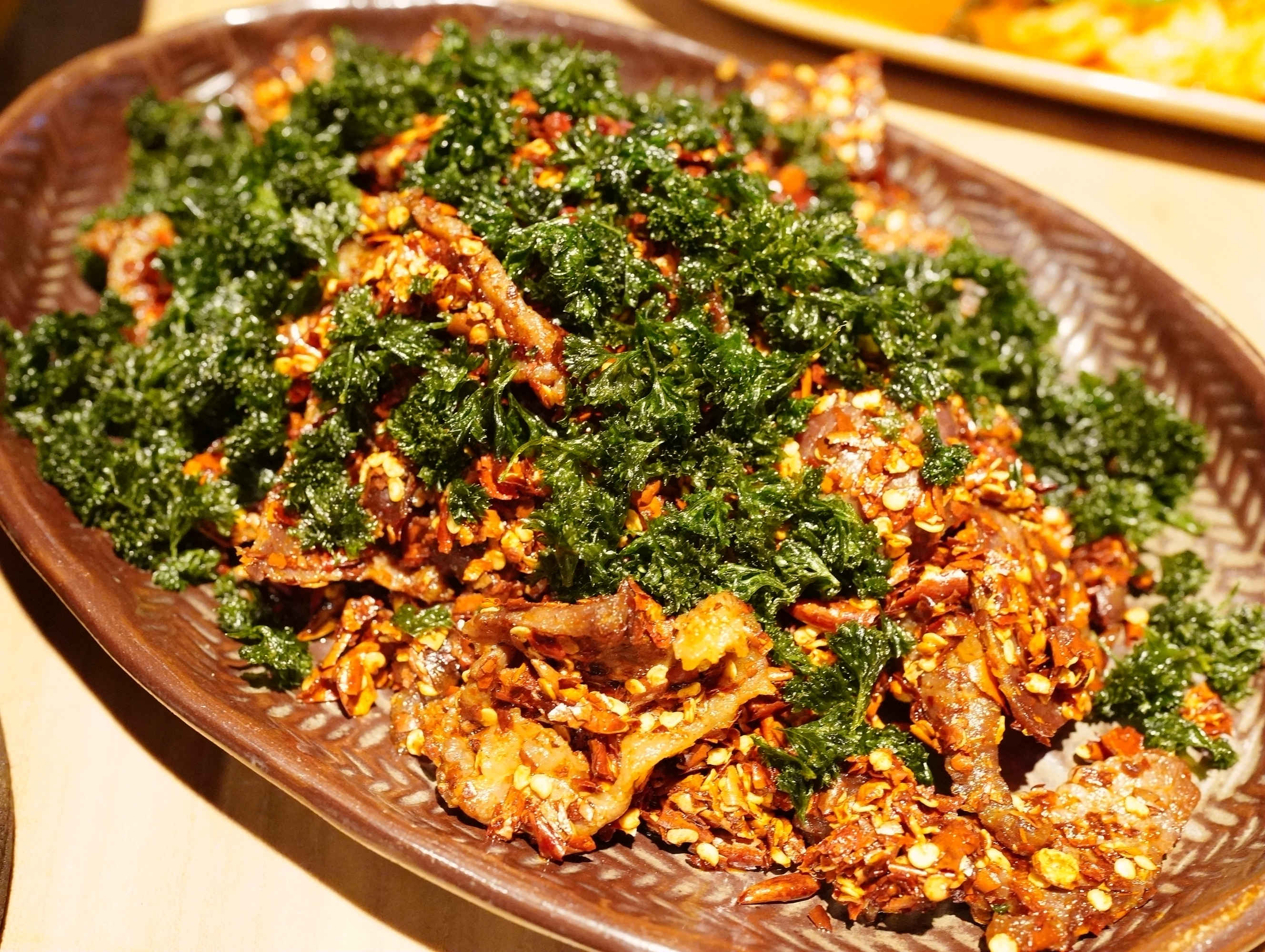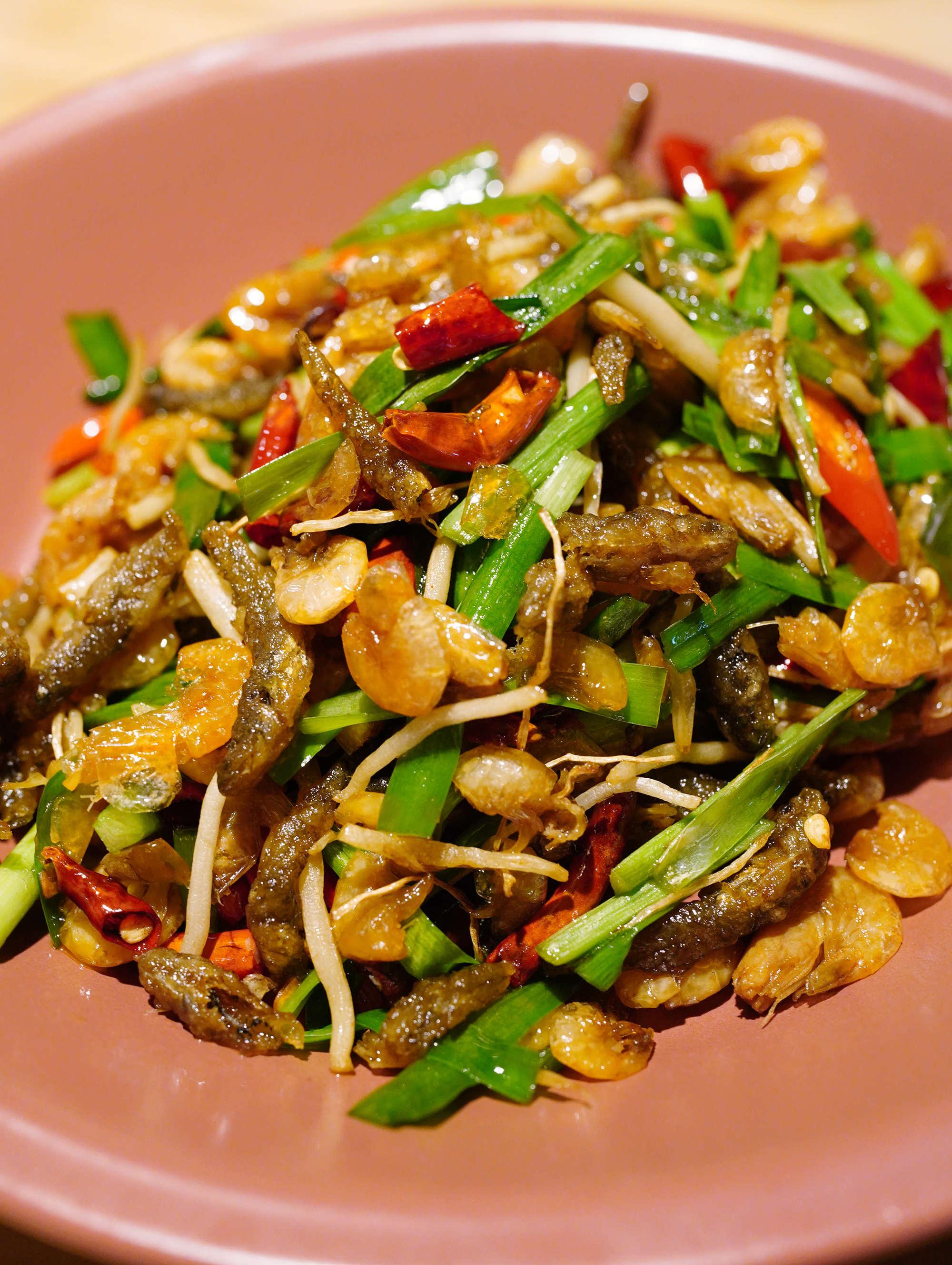 滇池小魚小蝦,真的是從昆明空運(yùn)來的小魚小蝦呀!細(xì)細(xì)碎碎跟韭菜一同炒香,驚喜還加了韭菜根,細(xì)細(xì)的白絲風(fēng)味與韭菜葉迥然不同。