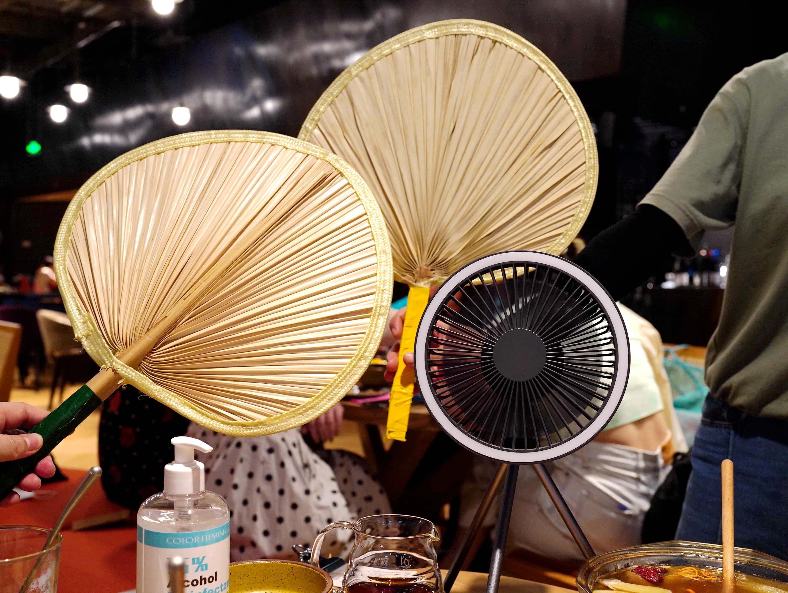 這一桌菜是又辣又燙,我們吃得滿頭大汗,服務(wù)員竟然送來了小電扇和蒲扇,真是及時(shí)雨!