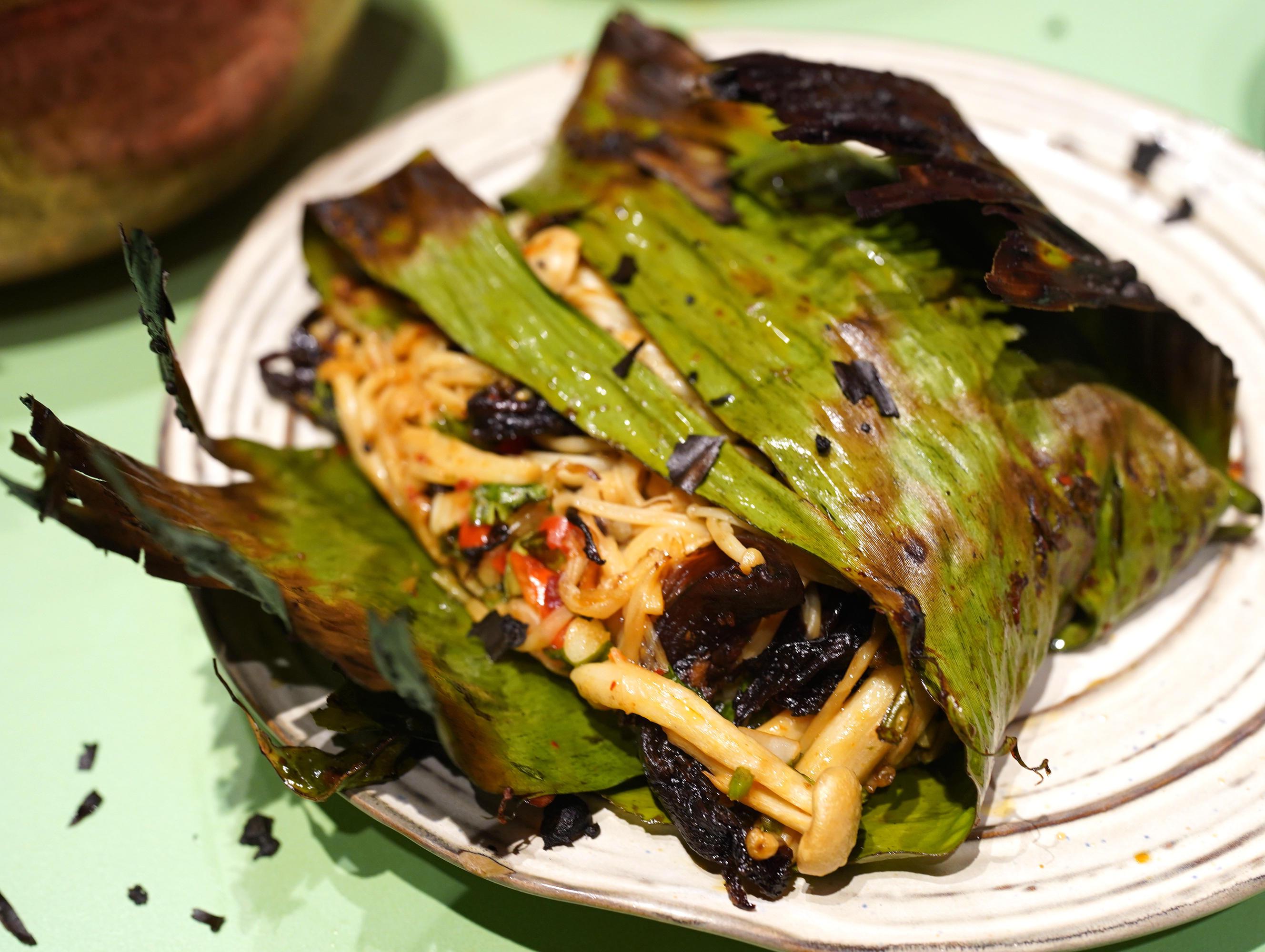 其實(shí)這里做的是西雙版納特有的傣味包燒,用天然的芭蕉葉把食物包起來放到炭火中烤……商場店的廚房不能用明火,改用電爐,損失了些許炭香,但芭蕉葉是從云南運(yùn)來的呢!