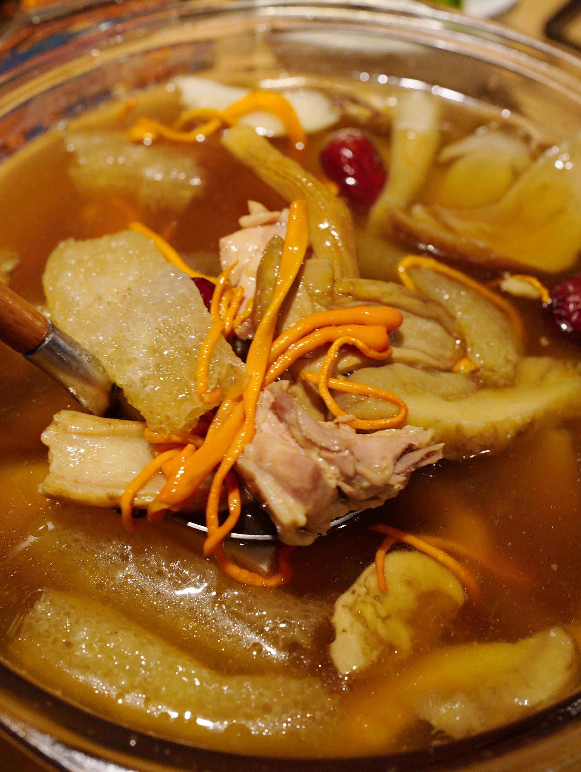 后來一鍋武定母雞湯,這雞我熟,在昆明的篆新農(nóng)貿(mào)市場見過,生得又肥又壯,肚子里還有一串未成形的蛋蛋,燉出來的雞湯自帶鮮甜。