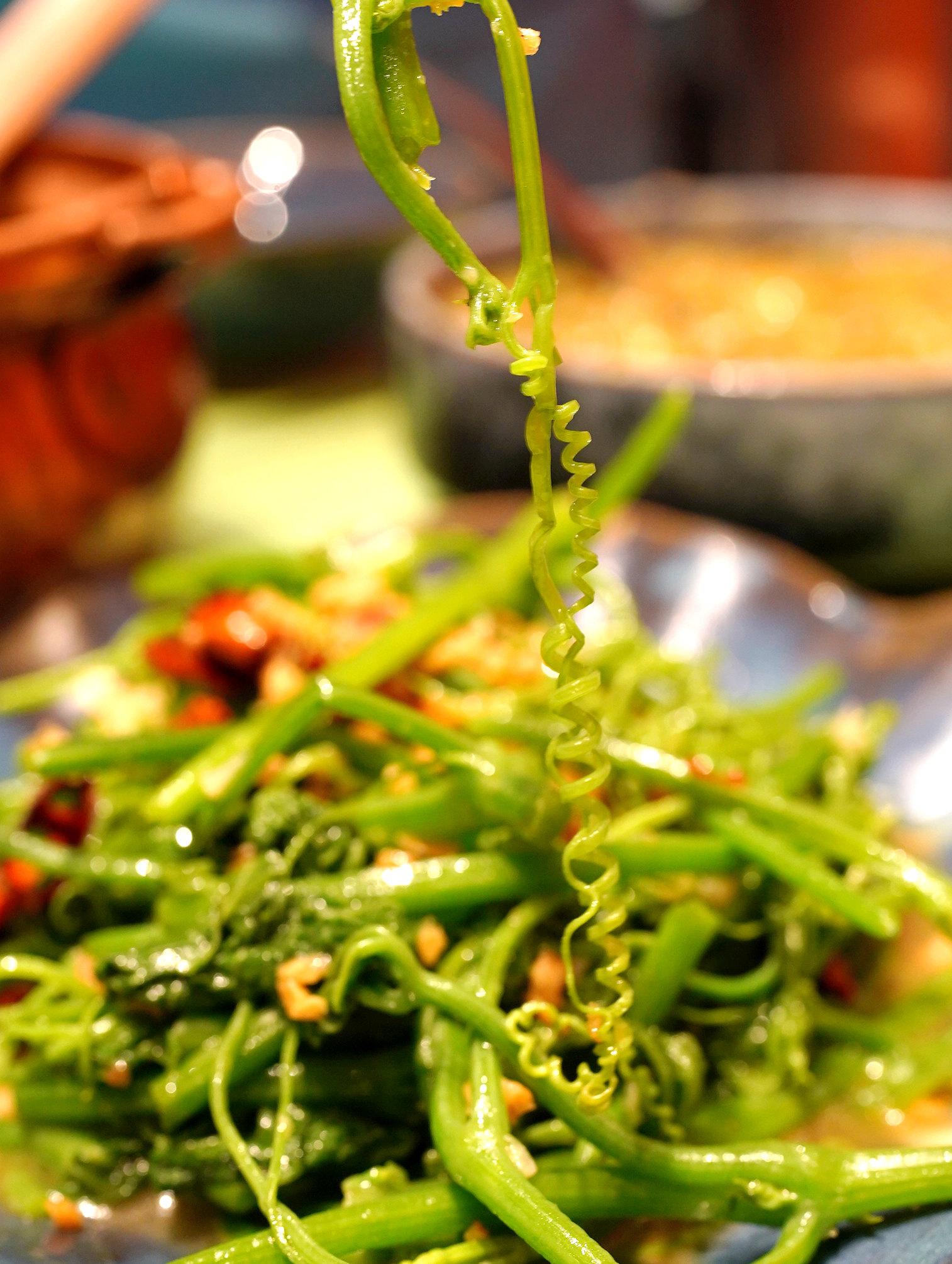 真的好羨慕云南人,各種稀奇的蔬菜都能吃上,好比今天就炒了一盤絲瓜尖,我猜是絲瓜的藤和葉,莖葉青翠又細(xì)嫩,還撩出了小彈簧似的一截,太可愛了。