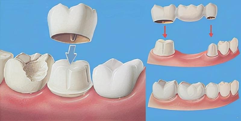 搭橋主要通過磨掉兩邊鄰牙的一層牙質(zhì),包上牙套并連帶中間假牙,三顆連接一起,形成類似“橋”的形狀,所以又稱為固定橋修復(fù)。