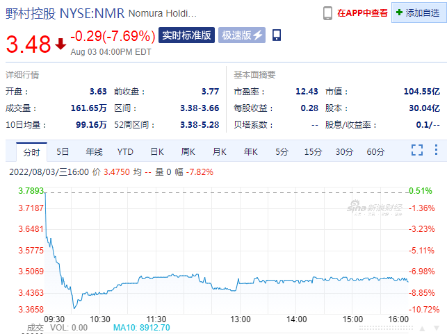 截止發(fā)稿,野村控股跌7.69%,報3.48美元/股。