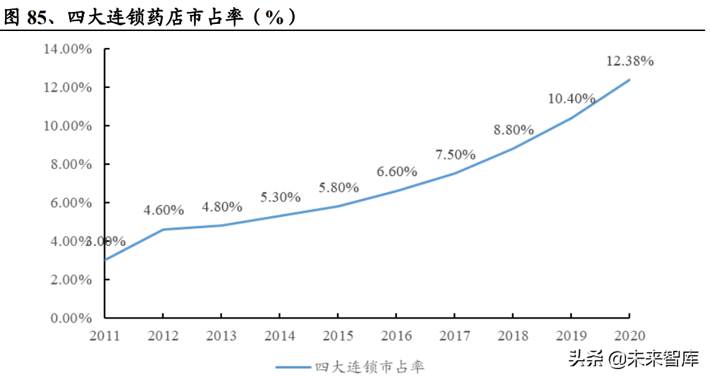5)合縱連橫時(shí)代,行業(yè)整合加速,集中度進(jìn)一步提升 2020 年,四大連鎖藥店收入利潤(rùn)增速遠(yuǎn)高于行業(yè)增速,市占率從 2019 年的 10.40% 提升至 12.38%。2021 年,四家藥店繼續(xù)加大擴(kuò)張力度,自建、并購(gòu)、加盟多種方 式驅(qū)動(dòng),合縱連橫,行業(yè)整合繼續(xù)加速。