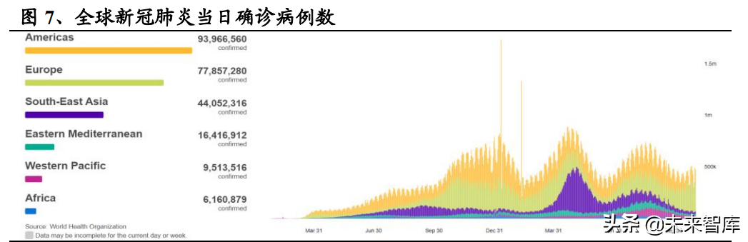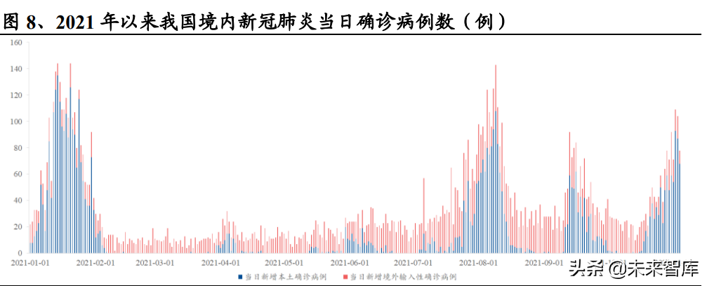 疫情仍處于較高流行水平,國(guó)內(nèi)時(shí)有零星散發(fā)。隨著新冠疫苗接種率不斷提 升,各和地區(qū)疫情防控逐漸常態(tài)化,每日確診病例數(shù)基本保持平穩(wěn),但 仍處于較高水平。根據(jù) WHO 統(tǒng)計(jì)數(shù)據(jù),截至 2021 年 11 月 4 日,累計(jì)新冠 確診病例 247,968,227 例,其中 5,020,204 名患者死亡;當(dāng)日新確診患者數(shù)為 479,578 例,自 8 月 20 日上一波峰的 742,585 例確診新患,整體呈下降趨勢(shì),近期穩(wěn)中略 有增長(zhǎng)。近期國(guó)內(nèi)當(dāng)日新增本土確診病例數(shù)有所反復(fù),由于我國(guó)部分周邊疫 情快速上升,我國(guó)外防輸入壓力持續(xù)加大;疊加季節(jié)因素,容易引發(fā)疫情傳播擴(kuò) 散。