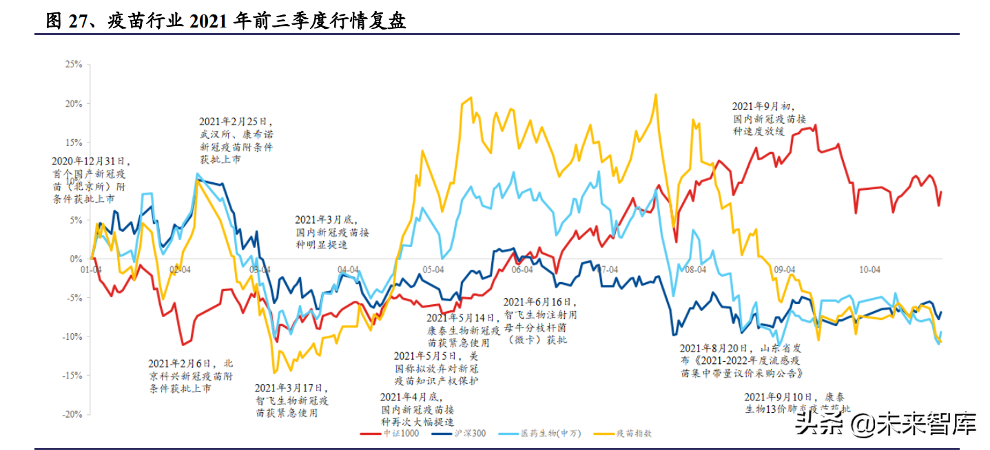 回顧 2021 年前三季度,疫苗板塊走勢(shì)波動(dòng)較大,預(yù)計(jì)主要受新冠疫苗預(yù)期變化 影響。從常規(guī)疫苗業(yè)務(wù)來(lái)看,“量?jī)r(jià)齊升”有望加速企業(yè)業(yè)績(jī)兌現(xiàn),行業(yè)成長(zhǎng)趨勢(shì) 顯著。今年以來(lái),板塊走勢(shì)受新冠疫苗帶來(lái)的增量業(yè)績(jī)預(yù)期影響較大,因此隨著 相關(guān)上市公司新冠疫苗的附條件/緊急獲批使用,以及國(guó)內(nèi)接種率的加速攀升,板 塊向上趨勢(shì);后續(xù)受新冠疫苗的降價(jià)預(yù)期影響,預(yù)期業(yè)績(jī)承壓;未來(lái)隨著相 關(guān)上市公司非新冠業(yè)務(wù)的穩(wěn)步增長(zhǎng),板塊走勢(shì)也有望再次企穩(wěn)。