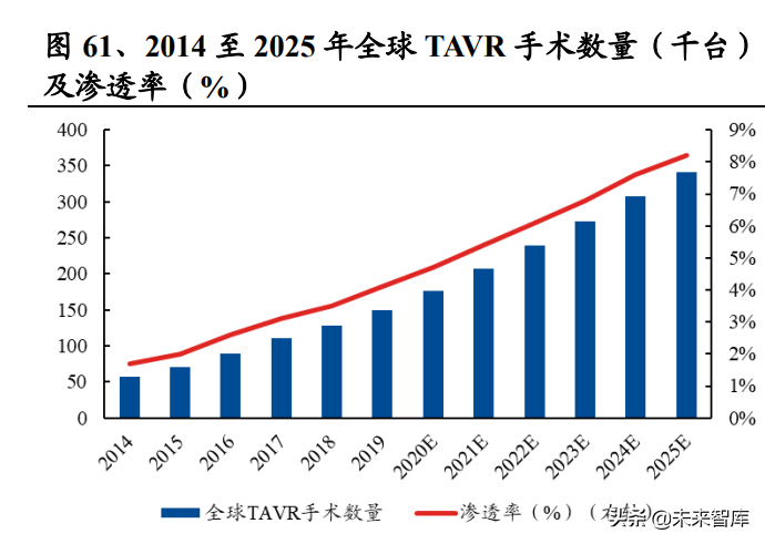 主動(dòng)脈瓣狹窄主要由風(fēng)濕熱的后遺癥、先天性主動(dòng)脈瓣結(jié)構(gòu)異?;蚶夏晷灾鲃?dòng)脈 瓣鈣化所致。由于左心室流出道的出口為主動(dòng)脈口,成人主動(dòng)脈瓣口面積≥3.0cm2, 當(dāng)主動(dòng)脈瓣口面積縮小至正常的 1/3 或更多時(shí),才會(huì)對(duì)血流產(chǎn)生阻塞。 TAVR 是領(lǐng)先的心血管介入技術(shù),通過(guò)血管路徑植入人工瓣膜以調(diào)節(jié)主動(dòng)脈 瓣狹窄,具有患者創(chuàng)傷較小及術(shù)后恢復(fù)期較短的優(yōu)勢(shì)。2019 年 8 月,美國(guó) FDA 將 TAVR 的適應(yīng)癥擴(kuò)大至涵蓋具有較低外科手術(shù)風(fēng)險(xiǎn)的患者。目前,在 SAVR 手 術(shù)的患者中具有較低外科手術(shù)的風(fēng)險(xiǎn)的患者占到約 80%,隨著適應(yīng)癥的擴(kuò)大將較 大幅度提升 TAVR 手術(shù)的可適用人群。從對(duì)有嚴(yán)重臨床癥狀的主動(dòng)脈瓣狹窄疾病 患者的調(diào)查來(lái)看,進(jìn)行主動(dòng)脈瓣置換術(shù)能大幅度提高患者生存率。
