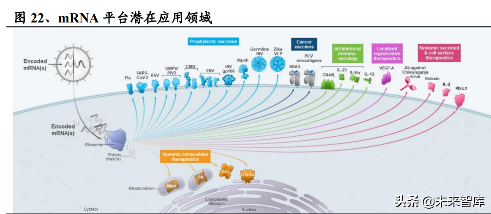 RNA 技術(shù)平臺(tái)在此次新冠疫苗研發(fā)中備受關(guān)注。上世紀(jì),mRNA 技術(shù)在調(diào)節(jié)/ 預(yù)防領(lǐng)域的發(fā)展受限于 mRNA 分子自身的免疫原性及其較低的目標(biāo)蛋白翻譯 率,更多地停留于概念驗(yàn)證;而隨著研究的不斷深入,通過(guò) mRNA 修飾與脂質(zhì)遞 送系統(tǒng)構(gòu)建已能很好解決上述問(wèn)題。盡管核酸藥物福米韋生鈉 fomivirsen sodium 已于 1998 年獲 FDA 批準(zhǔn)上市,但出于性等考慮,RNA 疫苗此前仍停 留于臨床研究階段。而在此次新冠疫情期間,mRNA 疫苗技術(shù)路徑大放異彩,優(yōu) 于眾多技術(shù)平臺(tái)的有性、開發(fā)速度、產(chǎn)能放大,及潛在的多聯(lián)多價(jià)優(yōu)勢(shì)使其成 為疫苗行業(yè)擬重點(diǎn)發(fā)力的下一代疫苗平臺(tái)。在新冠疫苗研發(fā)的大潮中,國(guó)內(nèi)也涌 現(xiàn)出了一批優(yōu)質(zhì)的 mRNA 疫苗企業(yè),如艾博生物、斯微生物、藍(lán)鵲生物、深信生 物、麗凡達(dá)生物、嘉晨西海等。基于該平臺(tái)化技術(shù),疫苗行業(yè)有望在新的預(yù)防/ 調(diào)節(jié)領(lǐng)域有所突破。