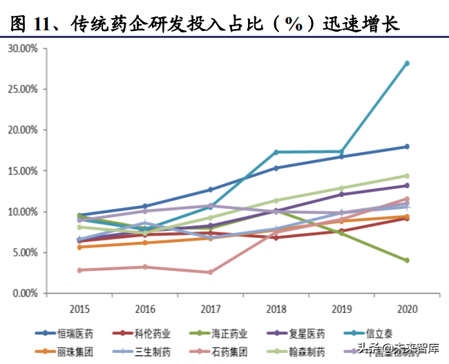 過(guò)去中國(guó)的醫(yī)藥企業(yè)不論在規(guī)模上還是數(shù)量上均迅速增加,但以仿制藥仿制器械 為主,創(chuàng)新能力普遍薄弱。隨著集采政策推出和競(jìng)爭(zhēng)加劇,本土企業(yè)尋求創(chuàng)新轉(zhuǎn)型。雖然處在轉(zhuǎn)型的不同階段,傳統(tǒng)企業(yè)近 5 年內(nèi)的研發(fā)投入增長(zhǎng)的趨勢(shì)還是較 為一致,研發(fā)投入占主營(yíng)業(yè)務(wù)收入的比例也在逐年攀升。