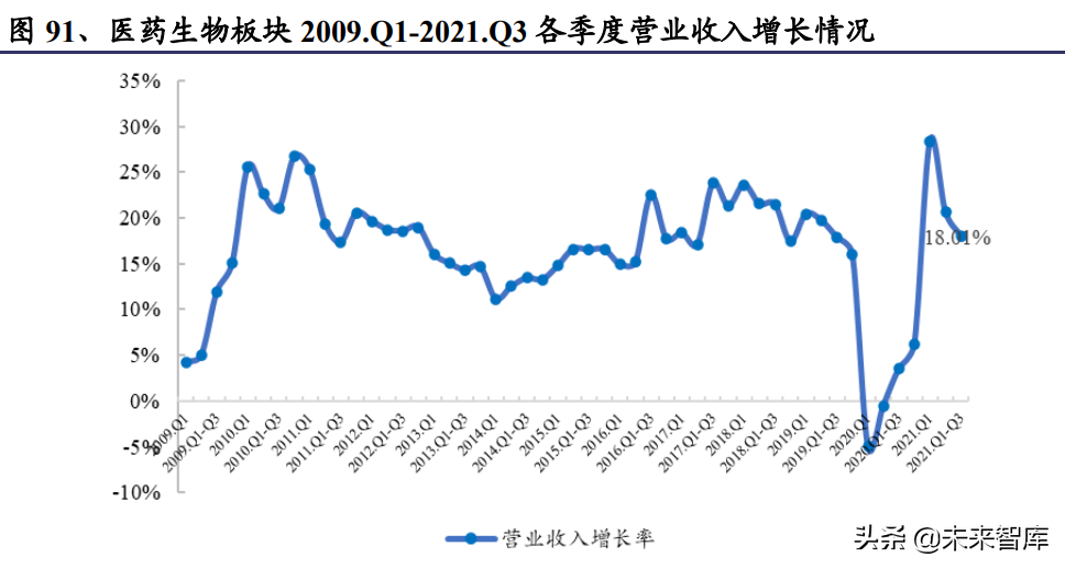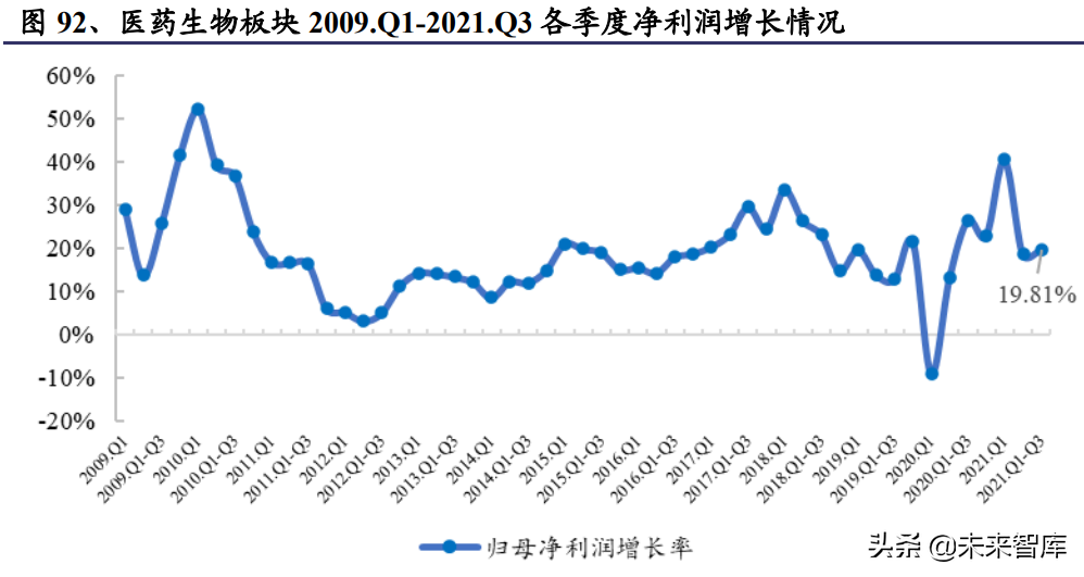 2021 年前三季度整體業(yè)績(jī)?cè)鲩L(zhǎng)趨穩(wěn):由于去年上半年國(guó)內(nèi)疫情爆發(fā),企業(yè)停工停 產(chǎn),醫(yī)院門診、手術(shù)暫停,患者流量減少,導(dǎo)致業(yè)績(jī)產(chǎn)生一定波動(dòng),但與其他行 業(yè)板塊相比影響較小。2021 年前三季度業(yè)績(jī)呈現(xiàn)較快增長(zhǎng),主要原因包括:(1) 部分抗疫相關(guān)產(chǎn)品需求激增,相關(guān)醫(yī)藥生物企業(yè)業(yè)績(jī)?cè)鲩L(zhǎng)較快;(2)隨著藥品和 器械的集中采購(gòu)逐漸成為常態(tài)化,醫(yī)保資金的結(jié)構(gòu)性變化較為,部分創(chuàng)新藥、 創(chuàng)新醫(yī)療器械相關(guān)企業(yè)業(yè)績(jī)?cè)鲩L(zhǎng);(3)疫情下醫(yī)藥板塊產(chǎn)品剛需屬性較為明 顯,業(yè)績(jī)相對(duì)穩(wěn)定。
