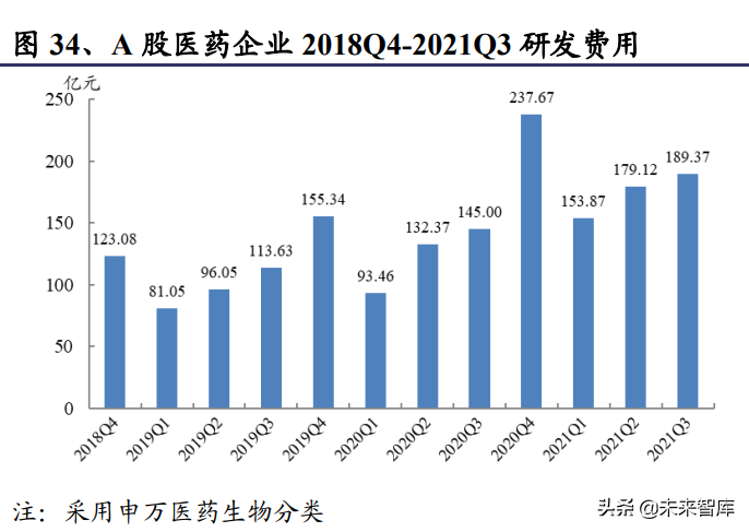 國(guó)內(nèi)方面,為應(yīng)對(duì)政策變化和市場(chǎng)競(jìng)爭(zhēng)加劇,近年來(lái)研發(fā)投入加速趨勢(shì),在 研發(fā)費(fèi)用和管線布局等方面都進(jìn)入了競(jìng)賽階段。雖然在研發(fā)額和研發(fā)費(fèi)用率 層面較海外仍有差距,但正處于快速提升的階段,向行業(yè)平均水平逐步趨近。 聚焦于 2021 年,以 A 股醫(yī)藥企業(yè)為例(申萬(wàn)醫(yī)藥生物分類),研發(fā)費(fèi)用保持逐季 環(huán)比增長(zhǎng)趨勢(shì),研發(fā)費(fèi)用率總體保持穩(wěn)定。
