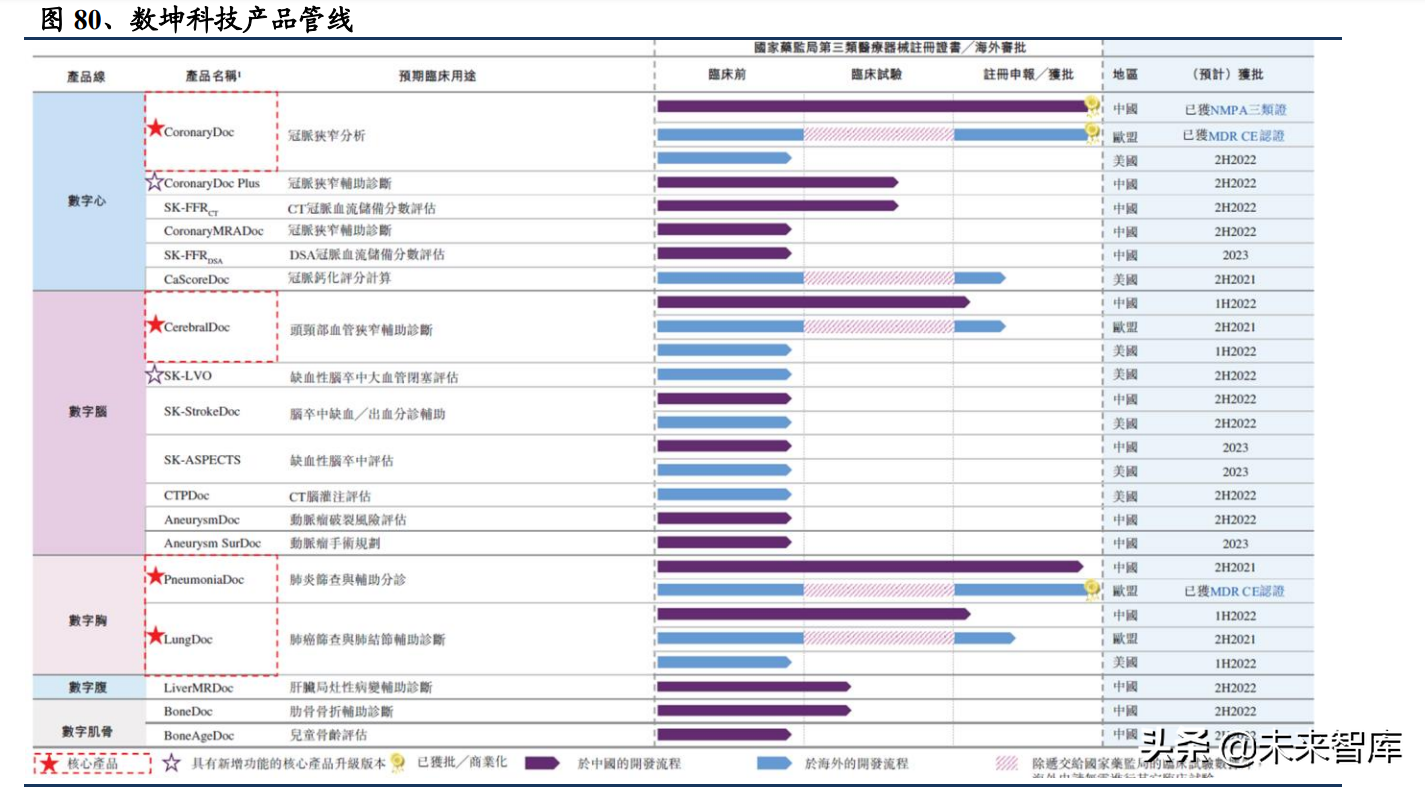 數(shù)字腦:數(shù)坤科技的數(shù)字腦產(chǎn)品管線核心產(chǎn)品為 CerebralDoc,該產(chǎn)品基于 CT 程序,輔助診斷頭頸部血管狹窄,未來(lái)將進(jìn)一步進(jìn)行產(chǎn)品迭代,實(shí)現(xiàn)自動(dòng)檢測(cè)血管 阻塞,快速定位阻塞點(diǎn)并協(xié)助醫(yī)生確定術(shù)前方案。2021 年數(shù)據(jù)顯示,其高敏感性 為 0.8690 高于不使用的 0.7645,是使用傳統(tǒng)診療所需時(shí)間的 1/13。單次掃描數(shù)據(jù) 即可對(duì)腦卒中影像全覆蓋,同時(shí)利用其他產(chǎn)品如 CTPDoc、SK-StrokeDoc 對(duì)出血 性或缺血性卒中疾病診療,減少患者輻射暴露,降低醫(yī)療成本。