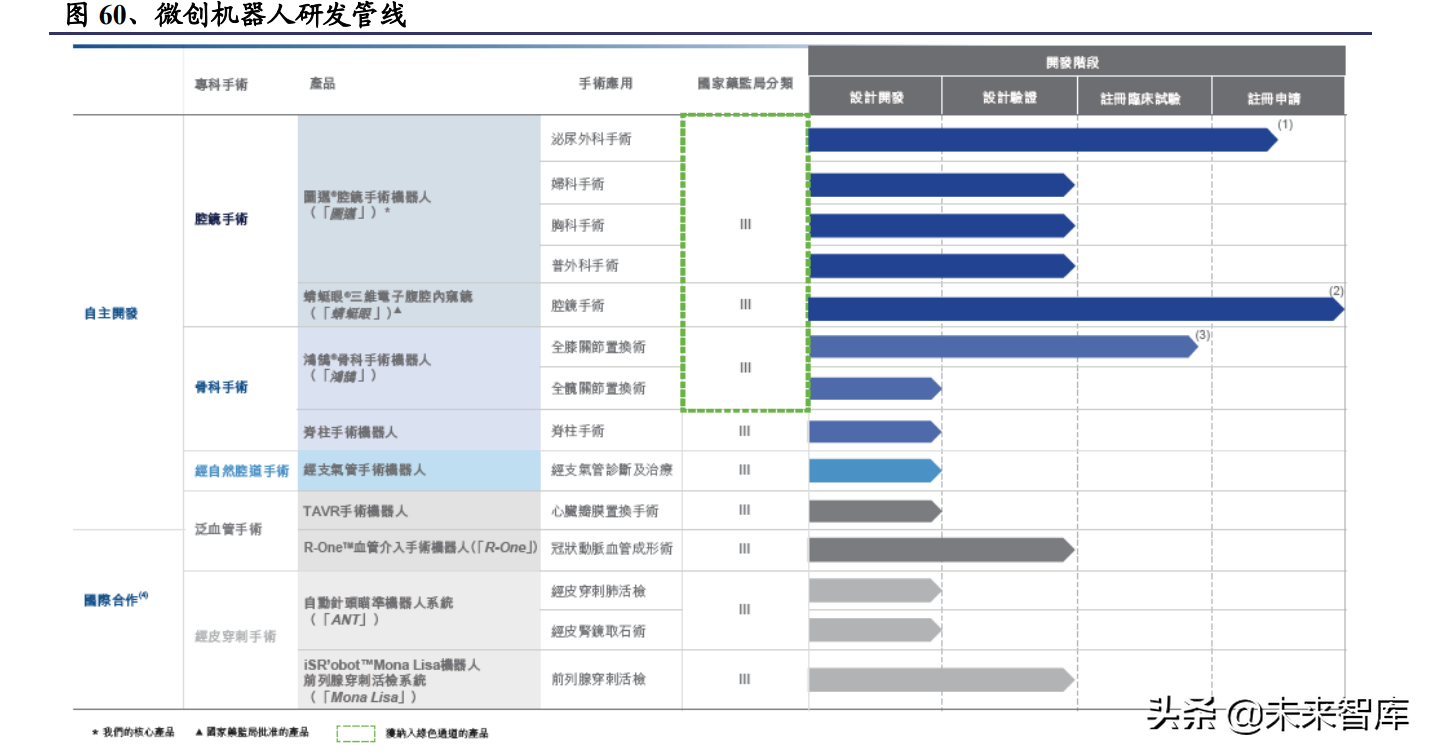 手術(shù)機(jī)器人被譽(yù)為下一代外科手術(shù)的新方式,其研發(fā)、制造涉及電子技術(shù)、機(jī)器 人技術(shù)、精密機(jī)械、傳感器技術(shù)、信號(hào)處理技術(shù)、生物化學(xué)、光學(xué)等多個(gè)學(xué)科, 研發(fā)難度極高。自 1999 年達(dá)芬奇手術(shù)機(jī)器人在美國(guó)獲批以來(lái),在手術(shù)機(jī)器人 市場(chǎng)穩(wěn)固龍頭地位,壟斷腔鏡手術(shù)機(jī)器人 20 多年。近年來(lái)國(guó)內(nèi)不斷涌現(xiàn)專注于醫(yī) 療手術(shù)機(jī)器人研發(fā)的國(guó)產(chǎn)企業(yè),如微創(chuàng)醫(yī)療機(jī)器人、天智航、鍵嘉、術(shù)銳等,在 不同外科手術(shù)領(lǐng)域頗有建樹。以微創(chuàng)機(jī)器人為例,其在研管線涉及腔鏡手術(shù)、骨 科手術(shù)、經(jīng)自然腔道手術(shù)、泛血管手術(shù)、經(jīng)皮穿刺手術(shù)五大類手術(shù)機(jī)器人,其中 圖邁機(jī)器人、蜻蜓眼電子腹腔鏡、鴻鵠機(jī)器人均進(jìn)入創(chuàng)新醫(yī)療器械綠色通道。