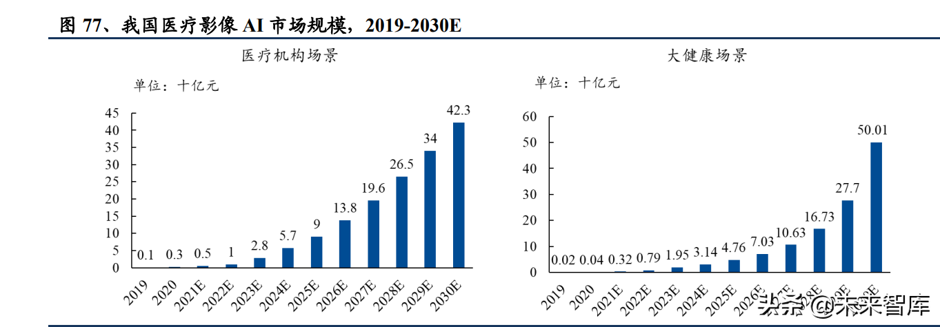 在應(yīng)用場(chǎng)景方面,伴隨著新應(yīng)用的崛起,醫(yī)療 AI 在院內(nèi)的傳統(tǒng)場(chǎng)景走向院外, 如保險(xiǎn)(以數(shù)聯(lián)易康為例,其醫(yī)保大數(shù)據(jù)智能監(jiān)管平臺(tái)提供醫(yī)保結(jié)算智能審 核服務(wù);其他的潛在應(yīng)用還包括參保人風(fēng)險(xiǎn)等級(jí)評(píng)估、理賠金額計(jì)算等),醫(yī) 美(美容建議生成)、新藥研發(fā)(分子性能預(yù)測(cè)、合成優(yōu)化、靶點(diǎn)發(fā)現(xiàn)、晶型 預(yù)測(cè)和篩選等)。
