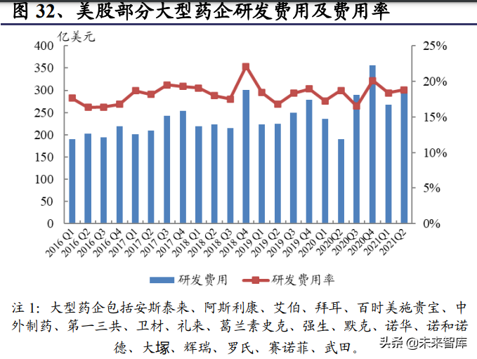 從研發(fā)投入角度來(lái)看,海外市場(chǎng)研發(fā)投入意愿總體較高,研發(fā)投入值與銷售 額同步變動(dòng)。聚焦于季度數(shù)據(jù),以 big pharma 為例,近年來(lái)研發(fā)費(fèi)用投入都維持 在較高水平,研發(fā)費(fèi)用率基本維持在 15%以上。
