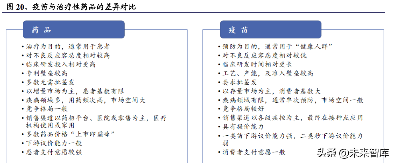 出于對(duì)性更高的要求,疫苗技術(shù)迭代傳導(dǎo)相對(duì)緩慢。疫苗作為生物制品,在 各主流法規(guī)監(jiān)管機(jī)構(gòu)均按照藥品進(jìn)行準(zhǔn)入審批和監(jiān)督管理。但預(yù)防性疫苗又與治 療性藥物存在諸多差異,由于使用對(duì)象、使用目的與生產(chǎn)方式的不同,疫苗的消 費(fèi)品屬性更強(qiáng),但質(zhì)量監(jiān)管要求也更高。因此,出于大規(guī)模使用的性考慮, 疫苗的臨床性要求更高,對(duì)不良反應(yīng)的容忍度更低。全新的技術(shù)平臺(tái)與全新 的疫苗佐劑都意味著漫長(zhǎng)的臨床驗(yàn)證周期和高昂的研究開發(fā)成本,這使得新技術(shù) 在疫苗領(lǐng)域的迭代相對(duì)較慢。(報(bào)告來(lái)源:未來(lái)智庫(kù))