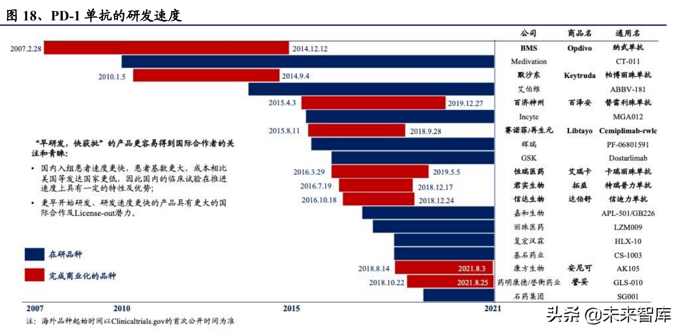 數(shù)據(jù)顯示,截至 2021 年 1 月 20 日,國(guó)內(nèi)已有 8 款 PD-1/PD-L1 單抗獲批,多款 進(jìn)入臨床開發(fā)階段,目前來(lái)看,賽道已經(jīng)擁擠,競(jìng)爭(zhēng)異常激烈,且國(guó)內(nèi)市場(chǎng) 將在未來(lái)趨于飽和;面對(duì)激烈的市場(chǎng)競(jìng)爭(zhēng),各大藥企紛紛通過(guò)拓展適應(yīng)癥、加速 臨床開發(fā)、差異化布局等策略來(lái)提升產(chǎn)品競(jìng)爭(zhēng)力。但長(zhǎng)遠(yuǎn)來(lái)看,隨著臨床試驗(yàn)的 逐步推進(jìn),PD-1/PD-L1 產(chǎn)品在國(guó)內(nèi)的供大于求將是必然出現(xiàn)的局面,僅僅著眼于 中國(guó)大陸的存量博弈將不會(huì)是一個(gè)好的選擇,相反,努力開拓中國(guó)以外的增量市 場(chǎng)將是頭部玩家的不二選擇。
