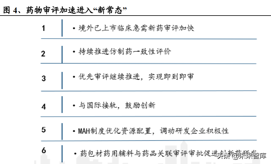 1、系列制度提速創(chuàng)新產(chǎn)品審評(píng),源頭引導(dǎo)差異化創(chuàng)新 從藥品審評(píng)政策來(lái)看,國(guó)務(wù)院 44 號(hào)、中辦國(guó)辦 42 號(hào)文件精神和改革措施持續(xù)推 進(jìn),藥品審評(píng)制度改革不斷深化,系列創(chuàng)新政策加速藥品審評(píng)審批。