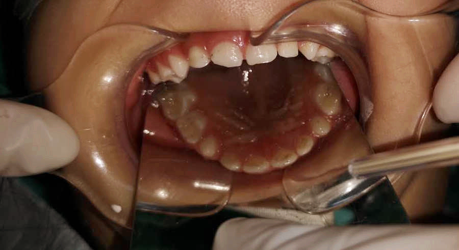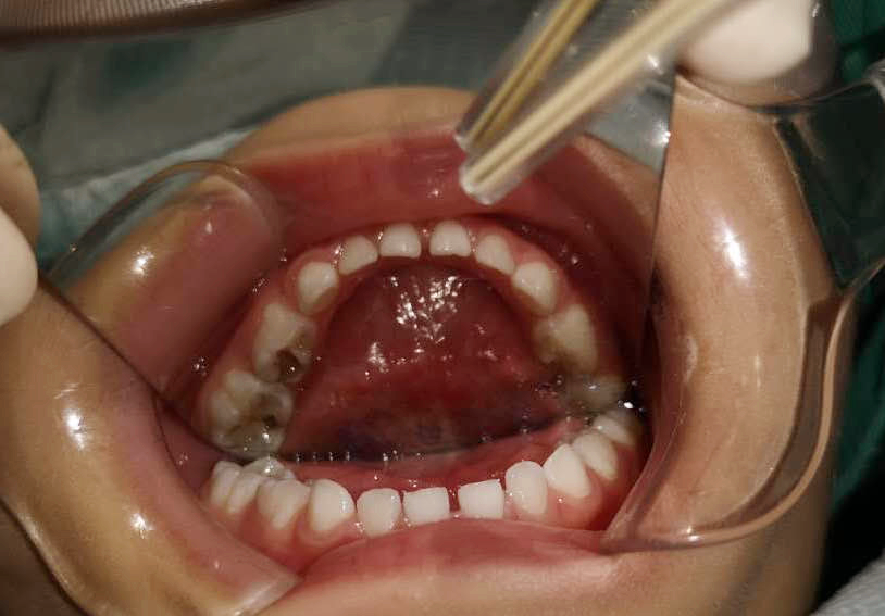 由于鑫鑫的牙齒齲壞數(shù)目多、情況嚴(yán)重,并且年齡偏小,調(diào)節(jié)難度很大,優(yōu)的調(diào)節(jié)方案是實施全麻下一次性口腔調(diào)節(jié)手術(shù)。