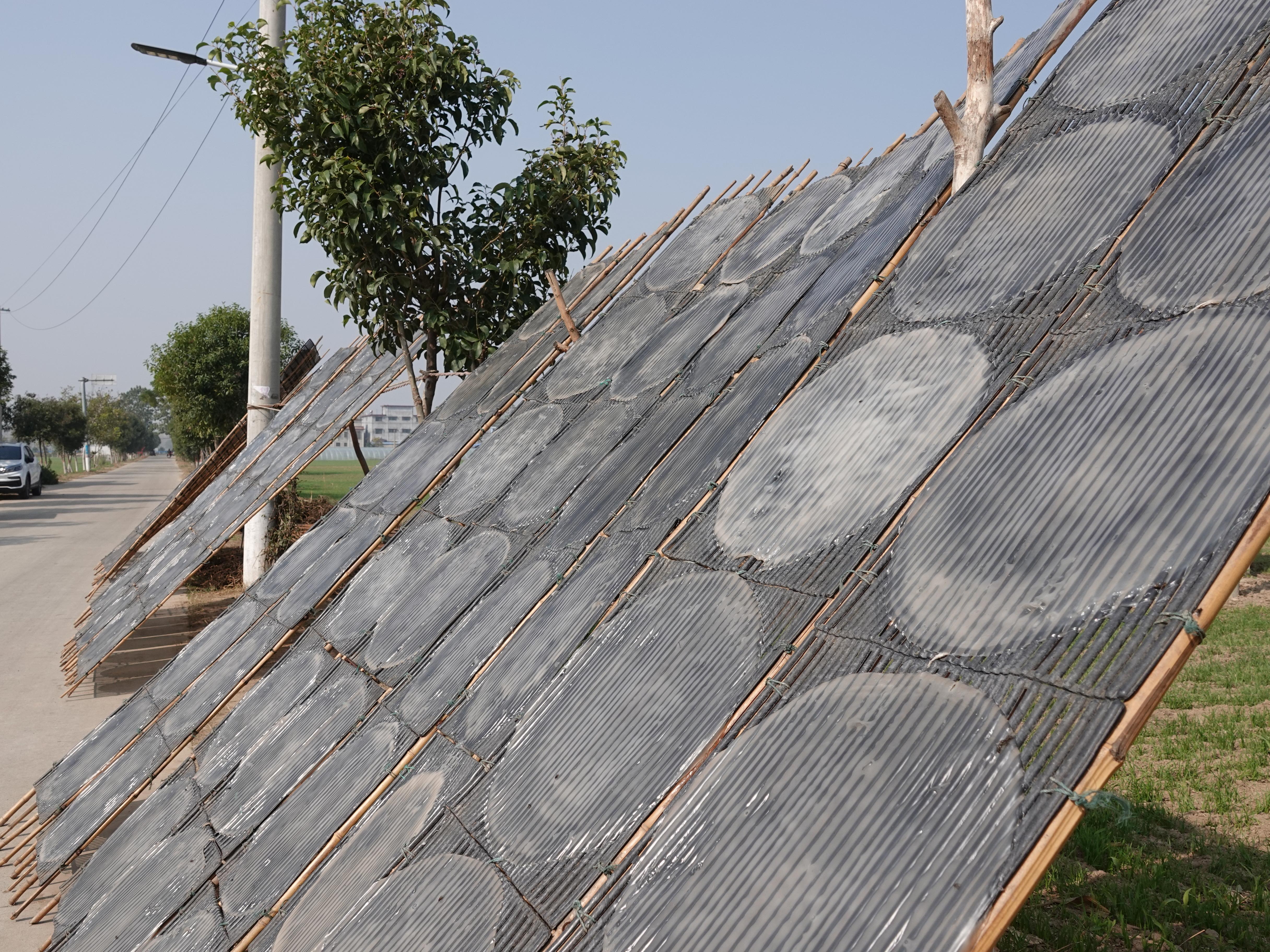 立冬剛過(guò),站在沈丘縣付井鎮(zhèn)楊莊村大街小巷放眼望去,只見(jiàn)一張張晶瑩透亮的粉皮晾曬在高粱稈穿成的簾子上,布滿(mǎn)房前屋后、田間地頭。有的農(nóng)戶(hù)忙著加工、搬運(yùn)、晾曬粉皮,有的農(nóng)戶(hù)正在查看粉皮干濕度或?qū)⒘篮玫姆燮ごa放整齊。