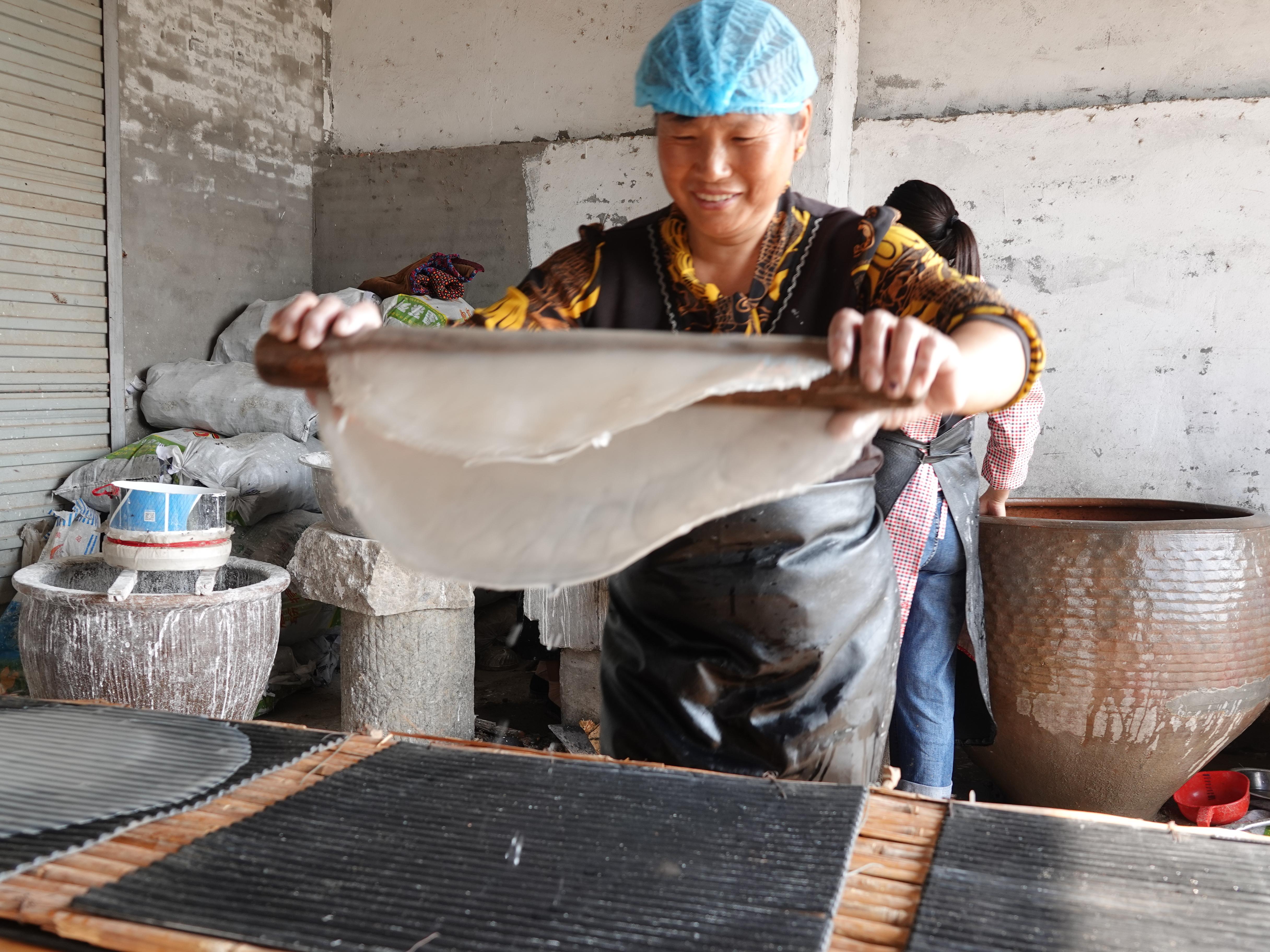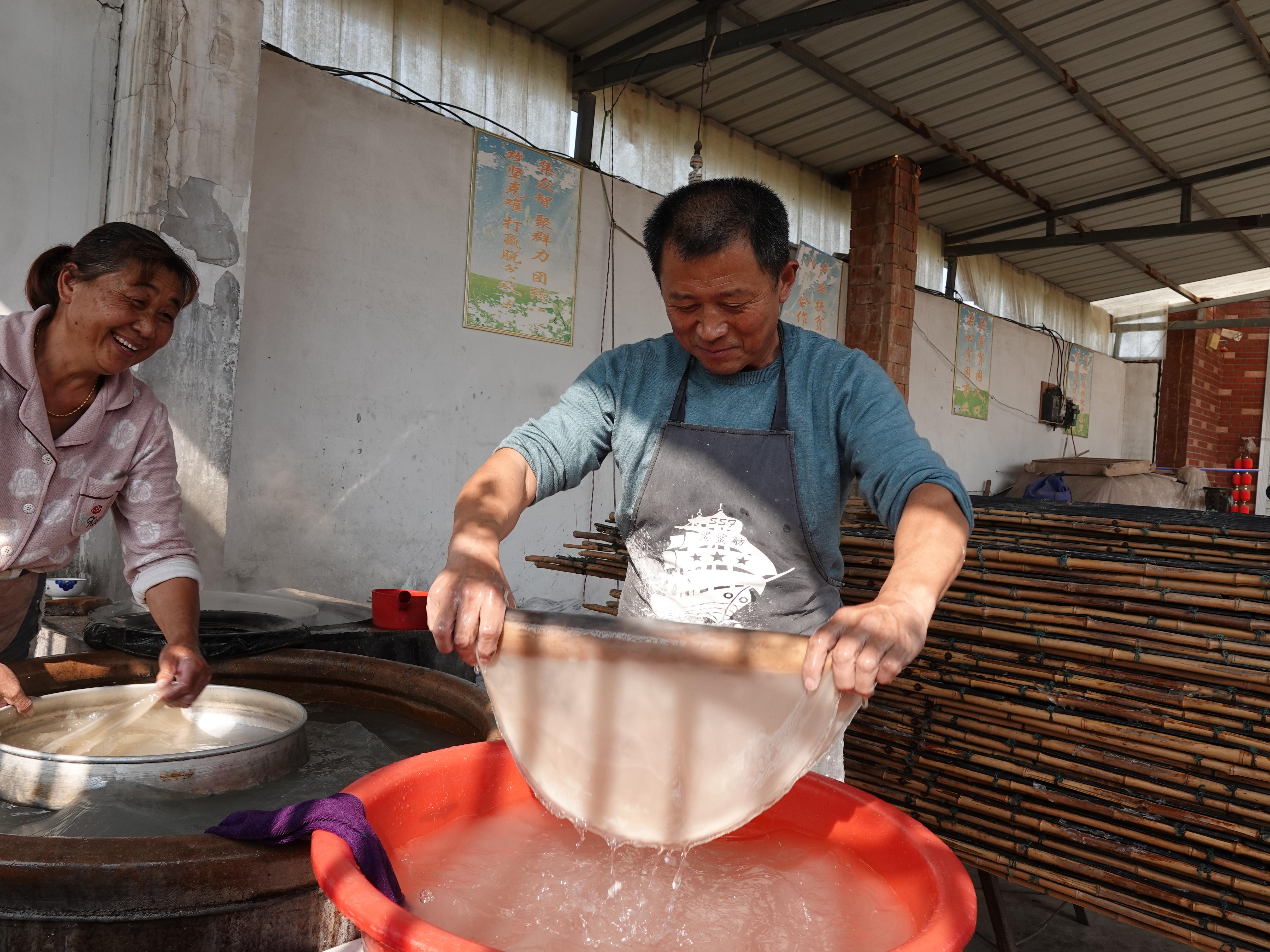 走進(jìn)村民呂彩蘭家,只見(jiàn)位于庭院一角的爐火正旺,灶臺(tái)上的大鐵鍋熱氣騰騰,呂彩蘭和丈夫楊友貴動(dòng)作嫻熟,正在旋制加工粉皮?!鞍臣覐氖路燮ぜ庸ぃ?0多年了。手工做出來(lái)的純紅薯粉皮口感筋道,訂單生產(chǎn),不愁銷(xiāo)路,俺家一年能賣(mài)出10萬(wàn)斤粉皮,純盈利30多萬(wàn)元沒(méi)問(wèn)題?!眳尾侍m快人快語(yǔ)。