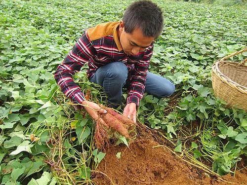 夏天,也就是在小麥?zhǔn)樟艘院螅迥信仙倬烷_始栽山芋了。耕地、整地、起壟,剪山芋秧苗、插山芋秧苗,這些都是必走流程。山芋秧苗栽不完咋辦呢,上街賣呀!我曾賣過山芋秧。一把山芋秧苗100棵,一捆5毛或2毛錢。背上30把山芋秧苗上街,也能掙他個幾塊錢。山芋秧苗全部剪完后,我們一幫7、8歲的小孩可來勁了,爭先恐后翻開“山芋母子”,總能在下面找到有花生個頭差不多大小的小山芋,我們稱作“小金果子”,找將“小金果子”在衣襟上擦一擦,就興高采烈地吃起來。咬一口,“小金果子”里濃濃的牛奶一樣的白漿和口水?dāng)嚭驮谝黄痦樦旖侵绷?,那個幸福感比現(xiàn)如今吃巧克力不知高上多少倍!