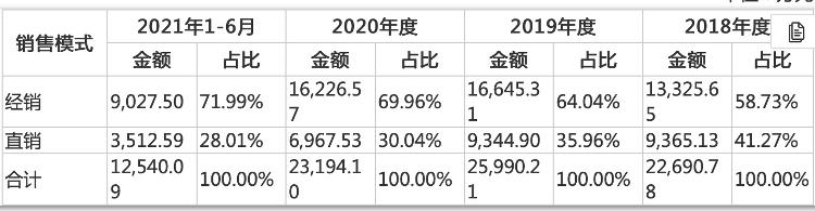 從銷售模式來(lái)看,滬鴿口腔以終端市場(chǎng)為導(dǎo)向,采取經(jīng)銷為主、經(jīng)銷和直銷相結(jié)合的銷售模式。2018年~2021年上半年,公司經(jīng)銷模式收入占主營(yíng)業(yè)務(wù)收入的比例分別為58.73%、64.04%、69.96%和71.99%,報(bào)告期內(nèi),直銷收入占比逐年下降。