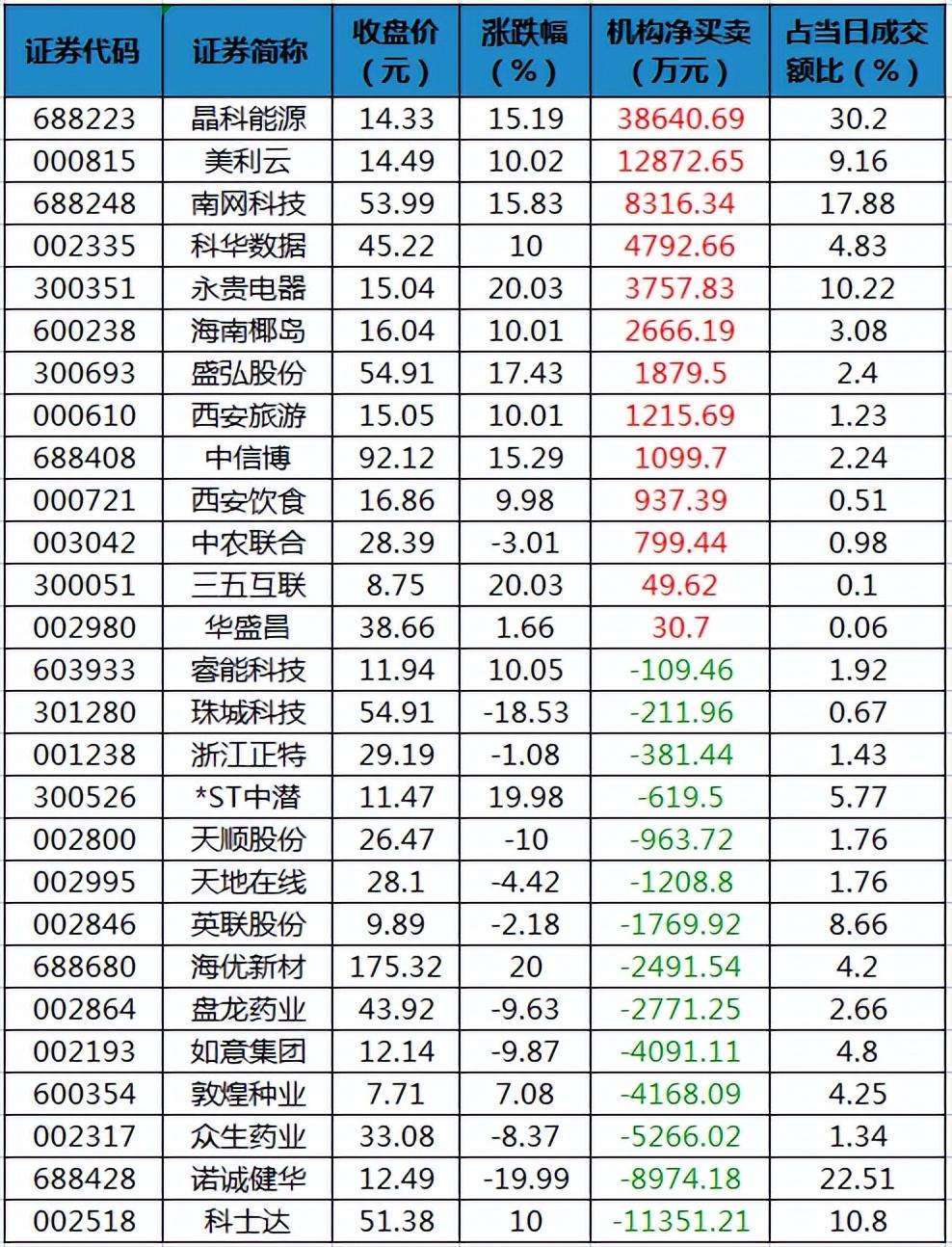 盤(pán)后龍虎榜數(shù)據(jù)顯示,周一機(jī)構(gòu)席位資金合計(jì)凈買(mǎi)入約3.27億元。其中,凈買(mǎi)入的個(gè)股13只,凈賣(mài)出的個(gè)股14只。機(jī)構(gòu)凈買(mǎi)入多的股票是晶科能源,凈買(mǎi)入金額約3.86億元;機(jī)構(gòu)凈買(mǎi)入居前的還有美利云、南網(wǎng)科技、科華數(shù)據(jù)等股。機(jī)構(gòu)凈賣(mài)出多的股票是科士達(dá),凈賣(mài)出金額約1.14億元;機(jī)構(gòu)凈賣(mài)出居前的還有諾誠(chéng)健華、眾生藥業(yè)、敦煌種業(yè)等股。