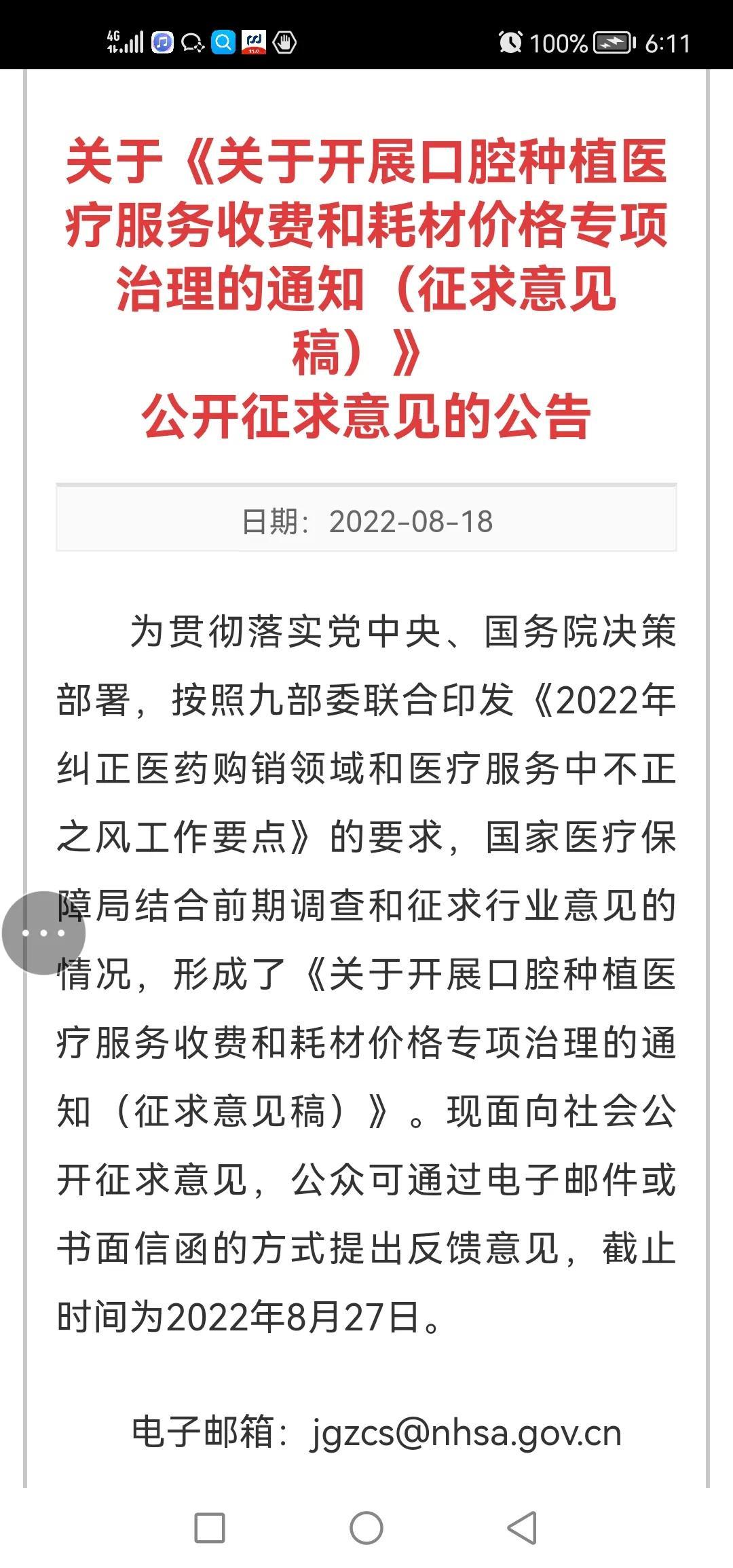 8月18日,醫(yī)療保障局就《關(guān)于開展口腔種植醫(yī)療服務(wù)收費(fèi)和耗材價(jià)格專項(xiàng)治理的通知(征求意見稿)向全社會(huì)征求意見,公開征求意見?!锻ㄖ窂囊龑?dǎo)種植牙牙冠形成合理價(jià)格,到規(guī)范整合口腔種植價(jià)格項(xiàng)目等12個(gè)方面,