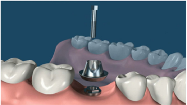 6. 安裝基臺:骨愈合后就可以進(jìn)行二期手術(shù)使種植體穿出牙齦,為了幫助牙齦軟組織更快的愈合,會通過手術(shù)把種植體的覆蓋螺釘取替換成愈合螺釘。