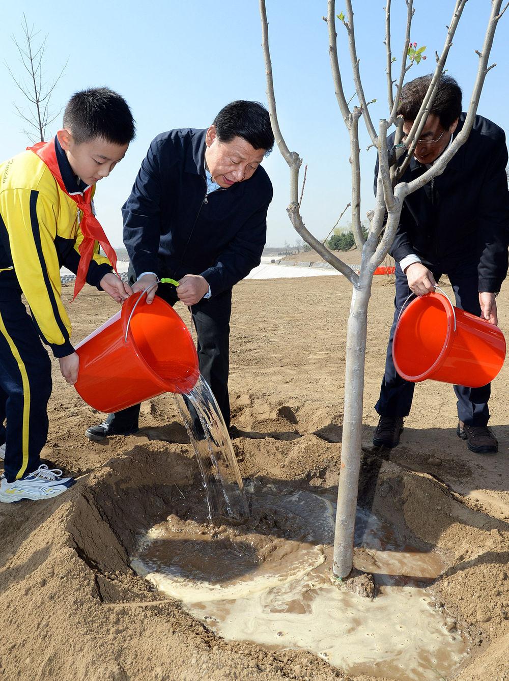 ↑2014年4月4日,黨和來(lái)到北京市海淀區(qū)南水北調(diào)團(tuán)城湖調(diào)節(jié)池參加首都義務(wù)植樹(shù)活動(dòng)。這是同大家一起給剛栽下的樹(shù)苗澆水。植樹(shù)結(jié)束時(shí),向工程負(fù)責(zé)人了解了南水北調(diào)水源的水質(zhì)與保護(hù)和調(diào)節(jié)池施工進(jìn)展情況。