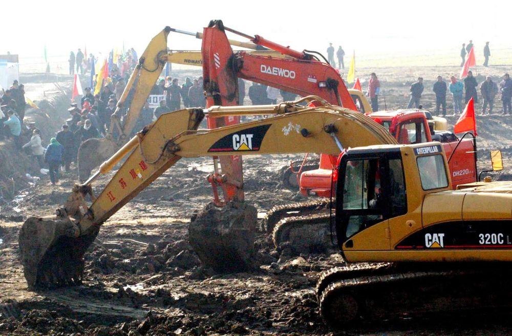 ↑2002年12月27日在江蘇揚(yáng)州寶應(yīng)縣南水北調(diào)東線工程潼河工地拍攝的施工現(xiàn)場(chǎng)。南水北調(diào)工程在這一天正式開(kāi)工建設(shè)。