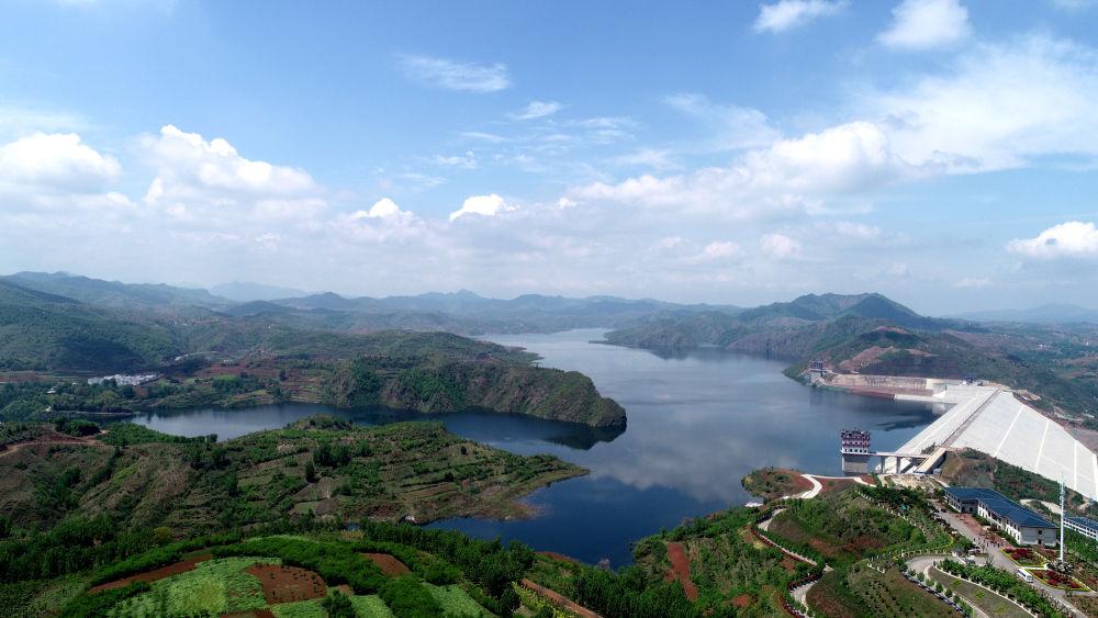 ↑位于河南省汝陽(yáng)縣前坪村的前坪水庫(kù),是一座以防洪為主,兼具供水、灌溉、發(fā)電功能的大型水利樞紐工程,是國(guó)務(wù)院確立的172項(xiàng)節(jié)水供水重大水利工程之一(無(wú)人機(jī)照片,4月26日攝)。