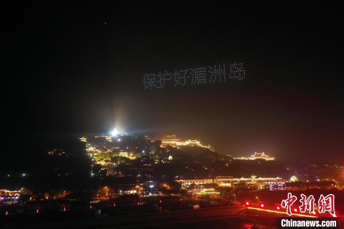 無人機(jī)將對(duì)媽祖和湄洲島的祝福映射在夜空上。 蔡昊 攝