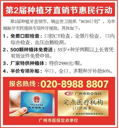 種植牙是目前國際口腔醫(yī)學(xué)界流行的缺牙修復(fù)方式。技術(shù)新穎但價(jià)格較高,導(dǎo)致不少缺牙街坊想種牙卻猶豫不決。為了讓大眾百姓都種得起高品質(zhì)的種植牙,日前,7大主流種植體廠商聯(lián)合廣州市某知名醫(yī)保定點(diǎn)醫(yī)院,啟動(dòng)“羊城第2屆種植牙直銷節(jié)”,種植體廠家直供,特惠價(jià)格讓市民種牙輕松無負(fù)擔(dān)!咨詢電話020-89888807。