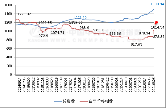 2、指數(shù)走勢2021年8月26日白芍價格指數(shù)值為1014.54點,低于此時總指數(shù)的1500.94點。從2014年7月6日至2021年8月26日白芍價格指數(shù)與總指數(shù)的歷史走勢來看,白芍價格指數(shù)與總指數(shù)出現(xiàn)兩次交叉,近5年一直往底部調(diào)整,產(chǎn)新期出現(xiàn)快速上升。