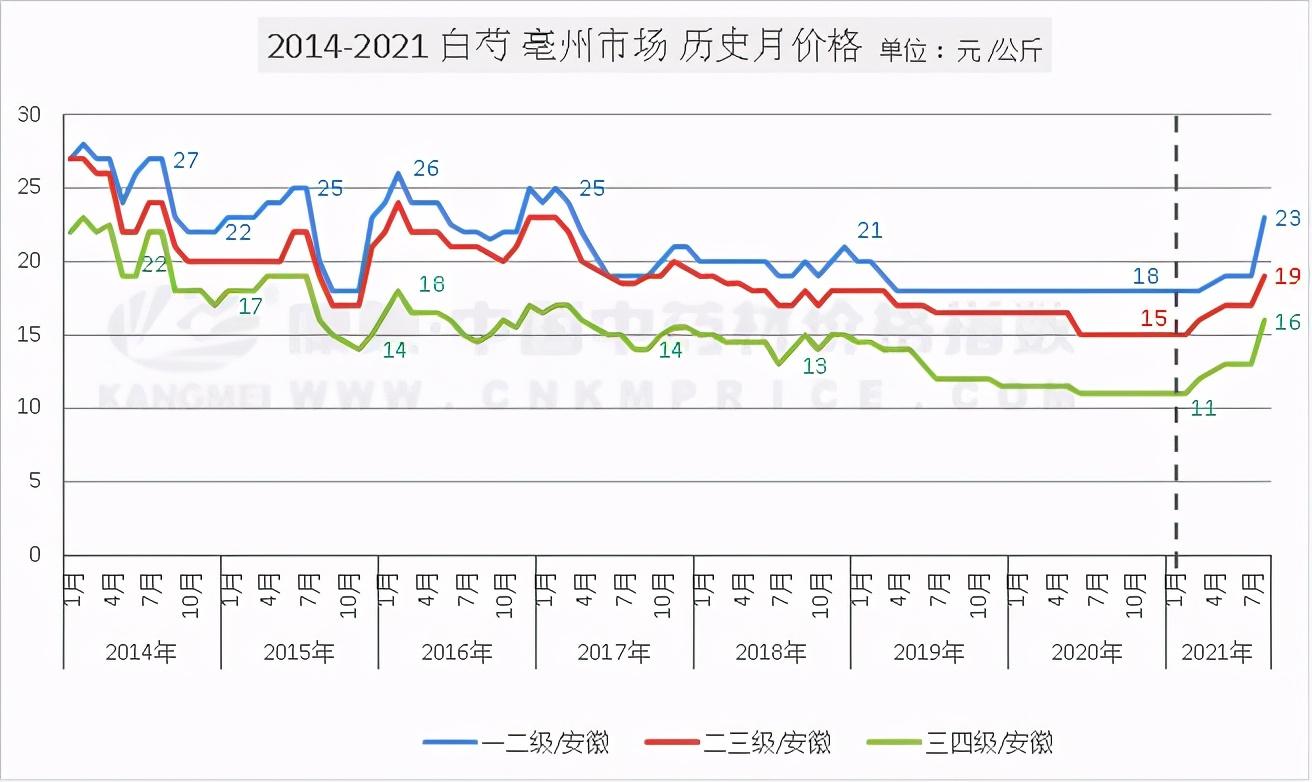 1、歷史價格走勢白芍生長年限高達4-5年,是個典型長周期品種,由于作為“花相”其觀賞價值好,有經(jīng)濟和社會益雙重屬性,十二五至十三五期間,被大量復(fù)制為觀光農(nóng)業(yè),新發(fā)展的產(chǎn)區(qū)較多,如山東、河南、山西、江蘇、湖南、湖北、四川等地,安徽周邊省市發(fā)展的規(guī)??芍^巨大,和牡丹一樣,千畝連片隨處可見。