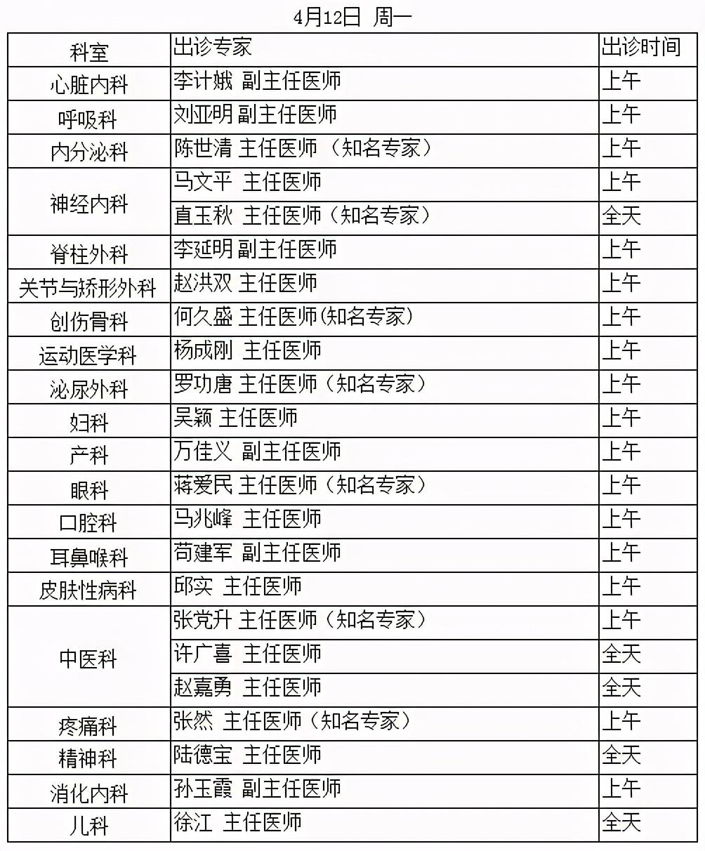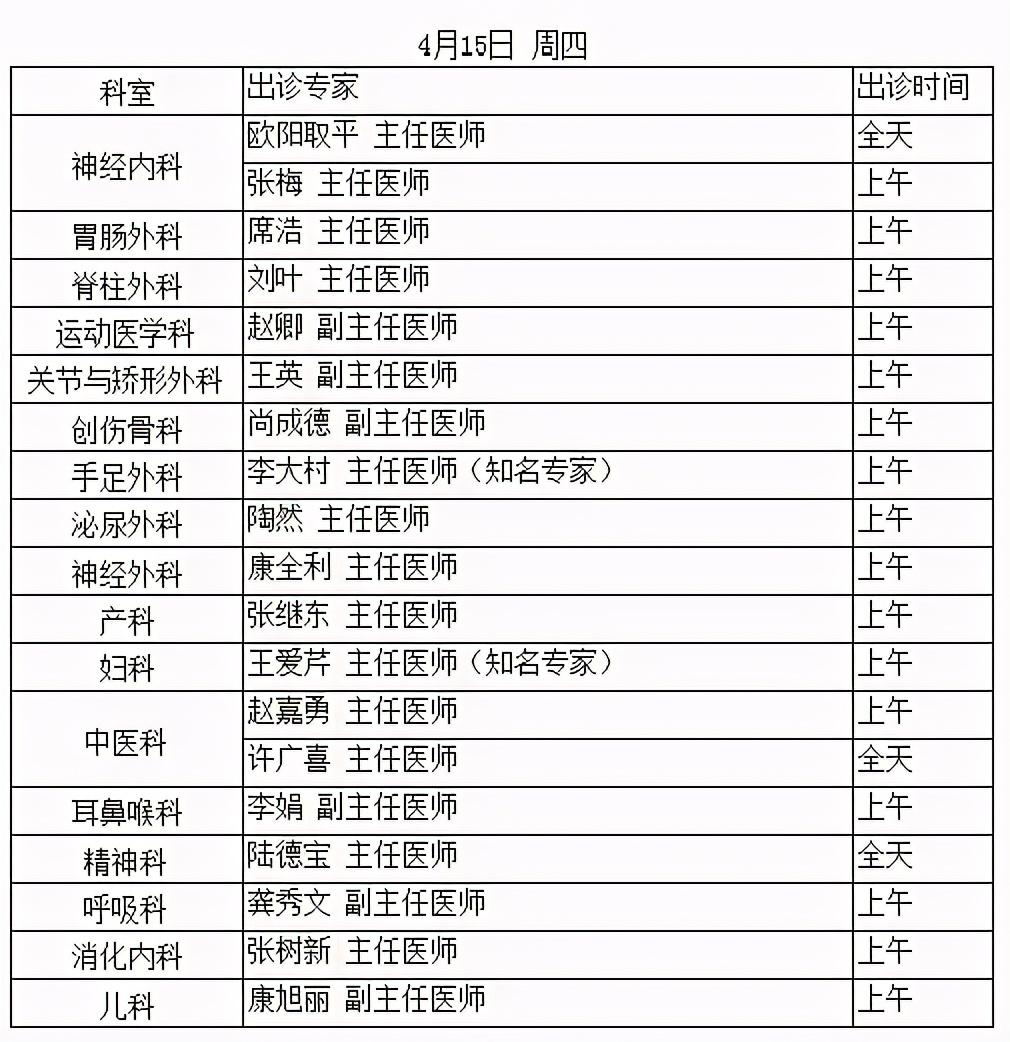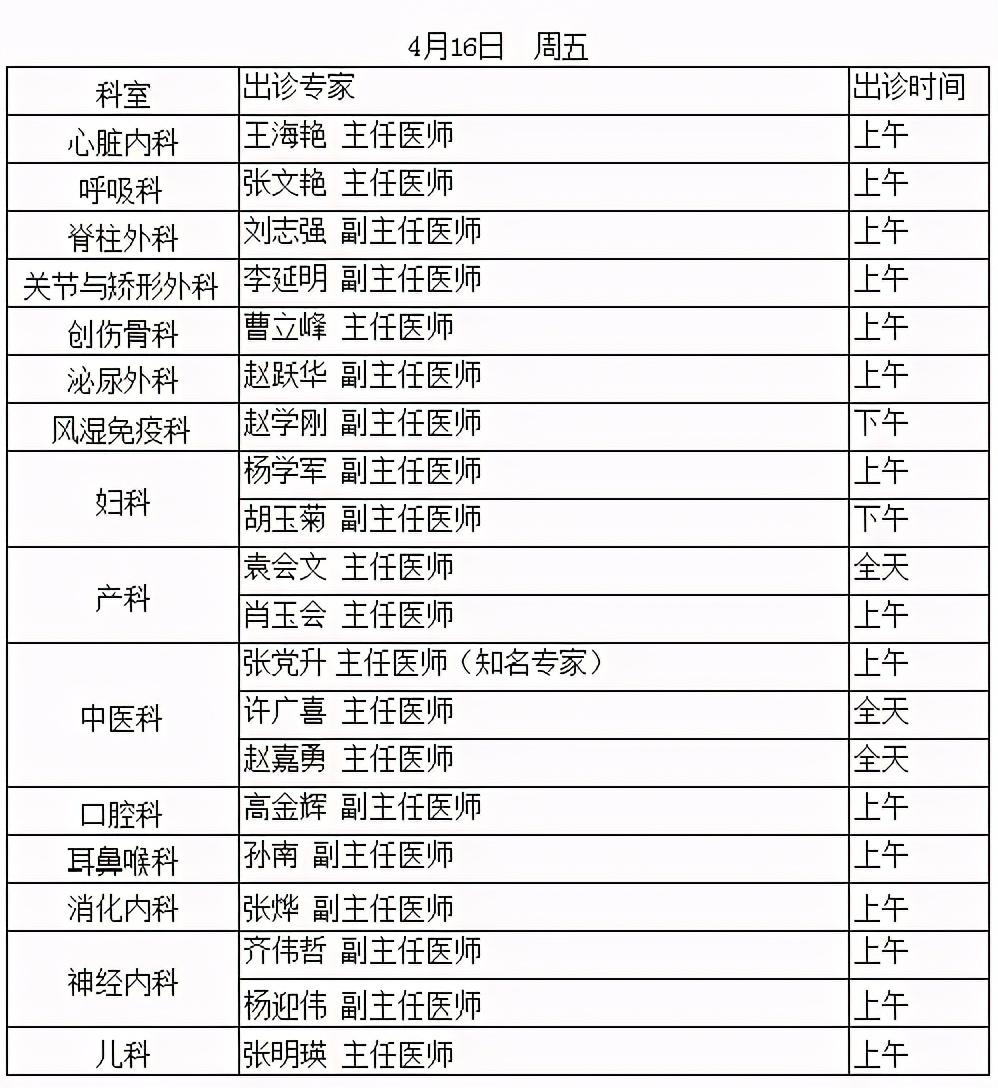 順義區(qū)醫(yī)院2021.4.12-4.16專家出診表