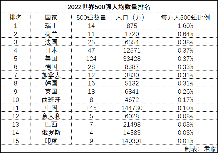 瑞士與荷蘭,每萬人擁有的500強比例分別是1.60%、0.64%,遠遠超出其它。